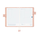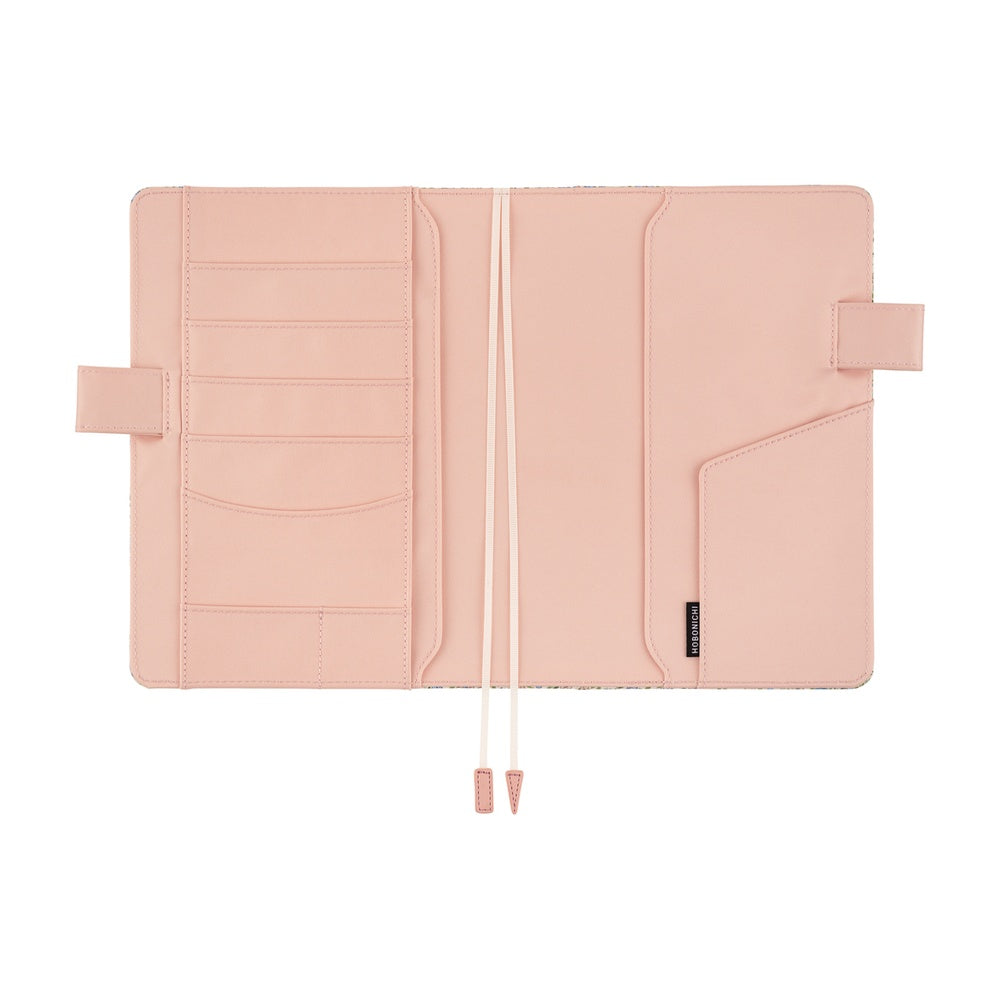 A small floral pattern reminiscent of the pastoral illustrations by picture book author Kate Greenaway. Pink and light blue anemones flutter gently, while small buds and leaves create a rich design that evokes a meadow swaying in the breeze. The inside is a pale pink. This is a cover where both cuteness and sophistication are balanced. It has "butterfly stopper" pen holders, which also function as a clasp to keep the cover shut.