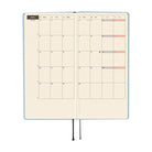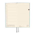 A paper with a smooth texture is used for the cover. The color is a bright blue, like a hazy yet bright, spring sky. While at first glance, this may look like a simple, single-color techo, upon closer inspection, you will see that a delicate layer of powder-like glitter covers all sides. Depending on the amount of light that shines on it, it will show its elegant sparkle. The year 2026 is stamped in silver foil. The cover has been constructed as a light hardcover book with some give to it so it still bends.