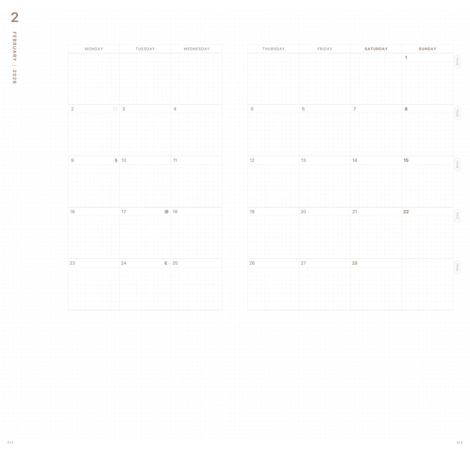 - Weekly Layout: Features a unique layout with one week per page, allowing you to view two weeks at a glance when the planner is open.