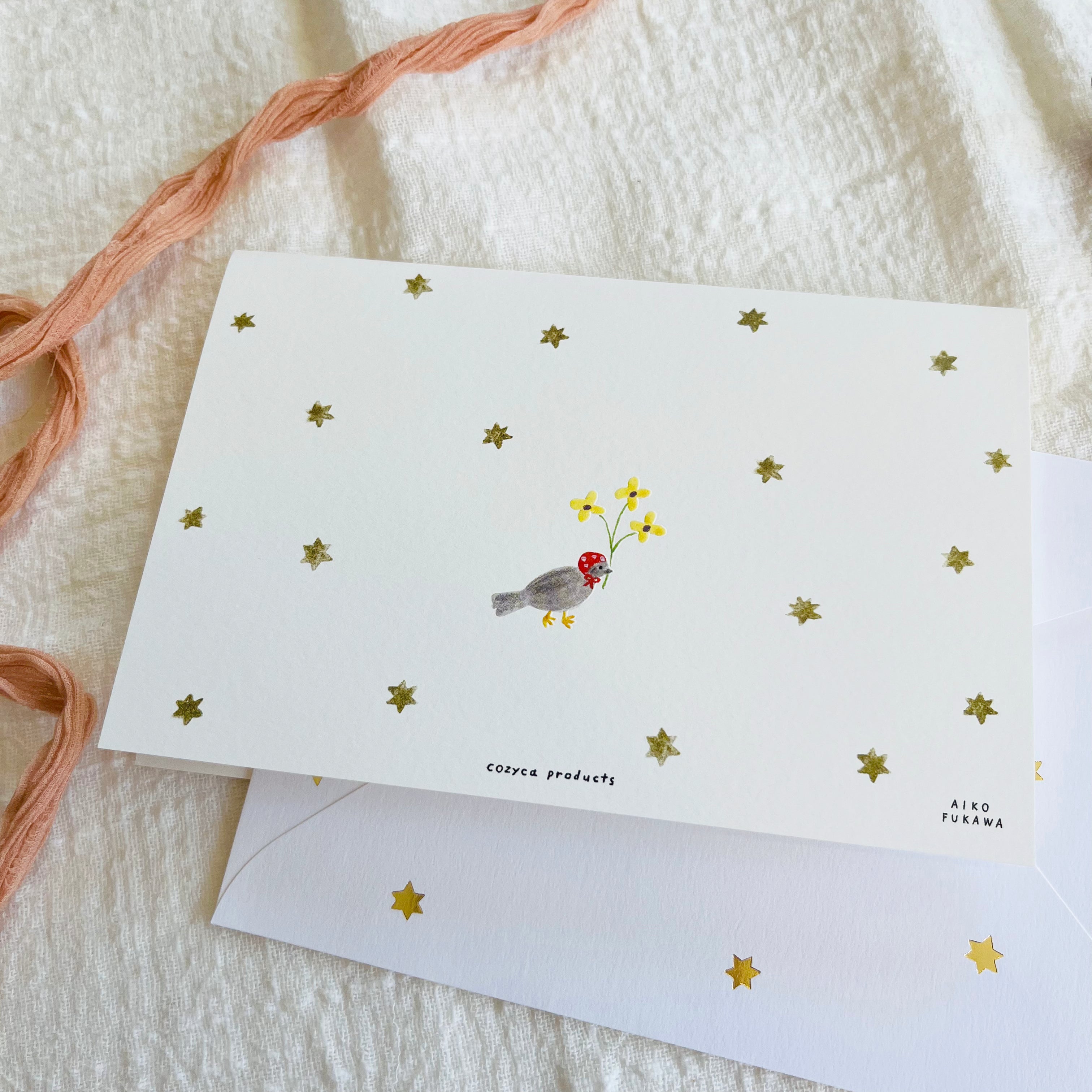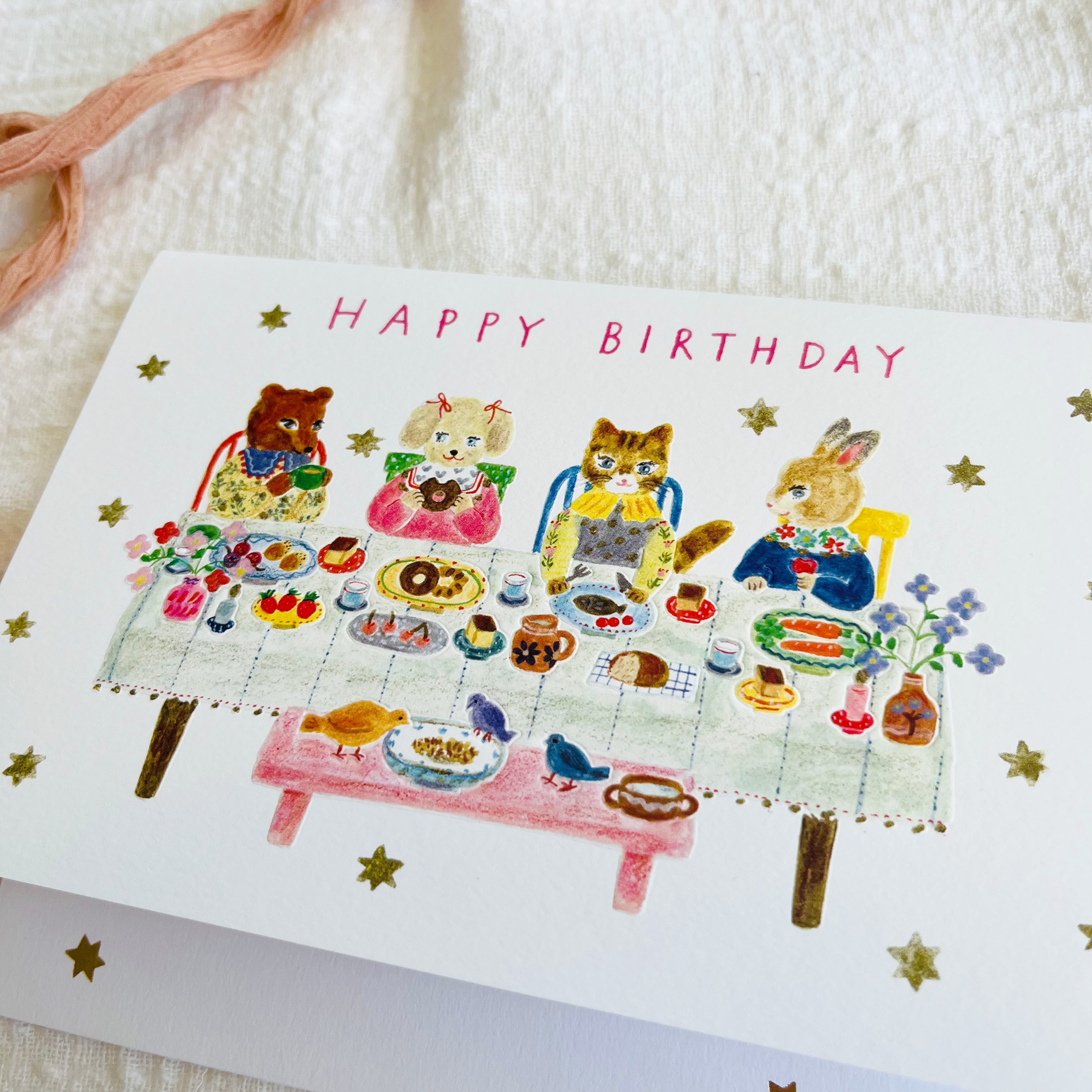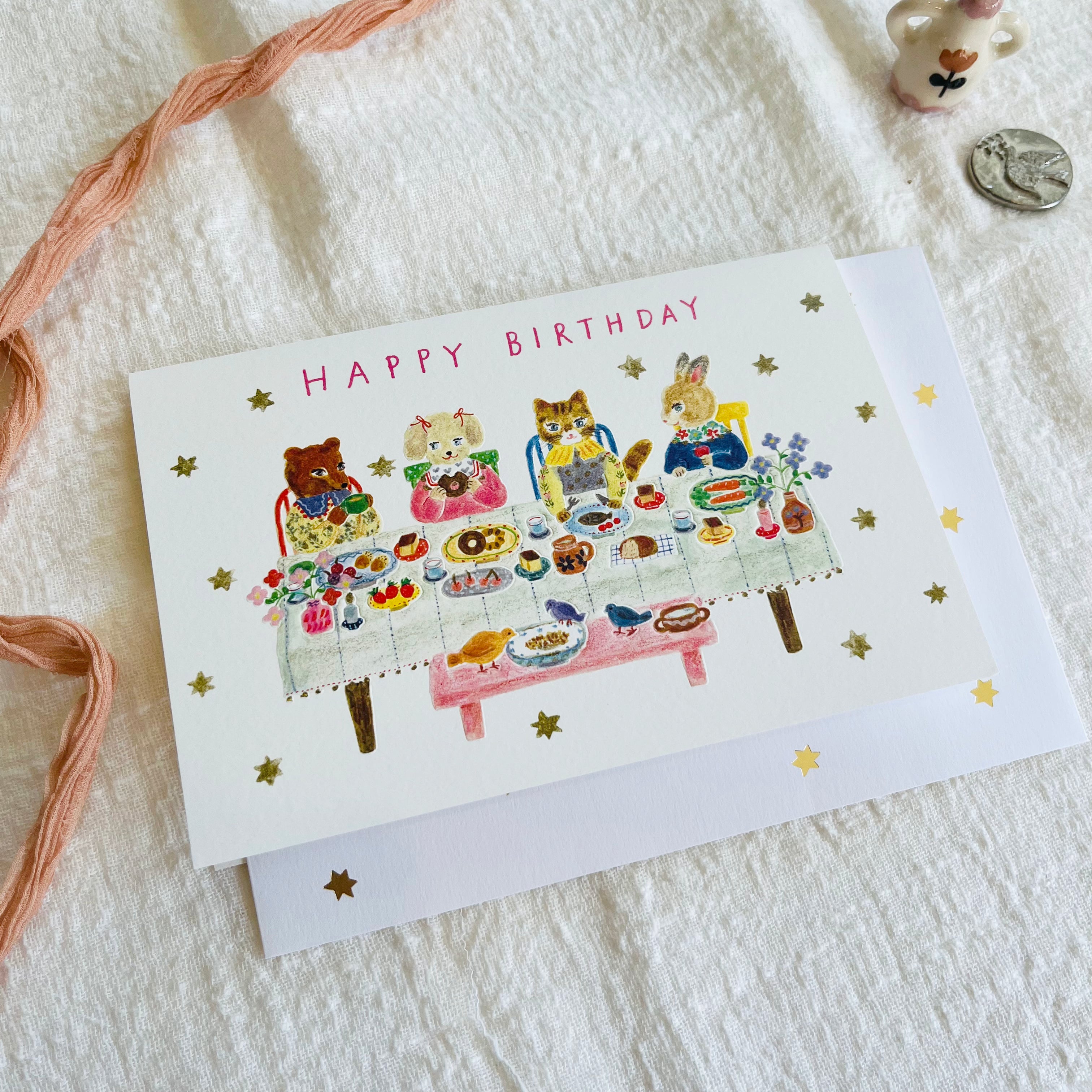 This birthday card is designed by illustrator Aiko Nunokawa. It depicts a scene from a lively and fun party. The entire card is embossed for a very cute finish. It comes with a sparkling gold foil envelope. Perfect for celebrating the birthday of a special someone.
