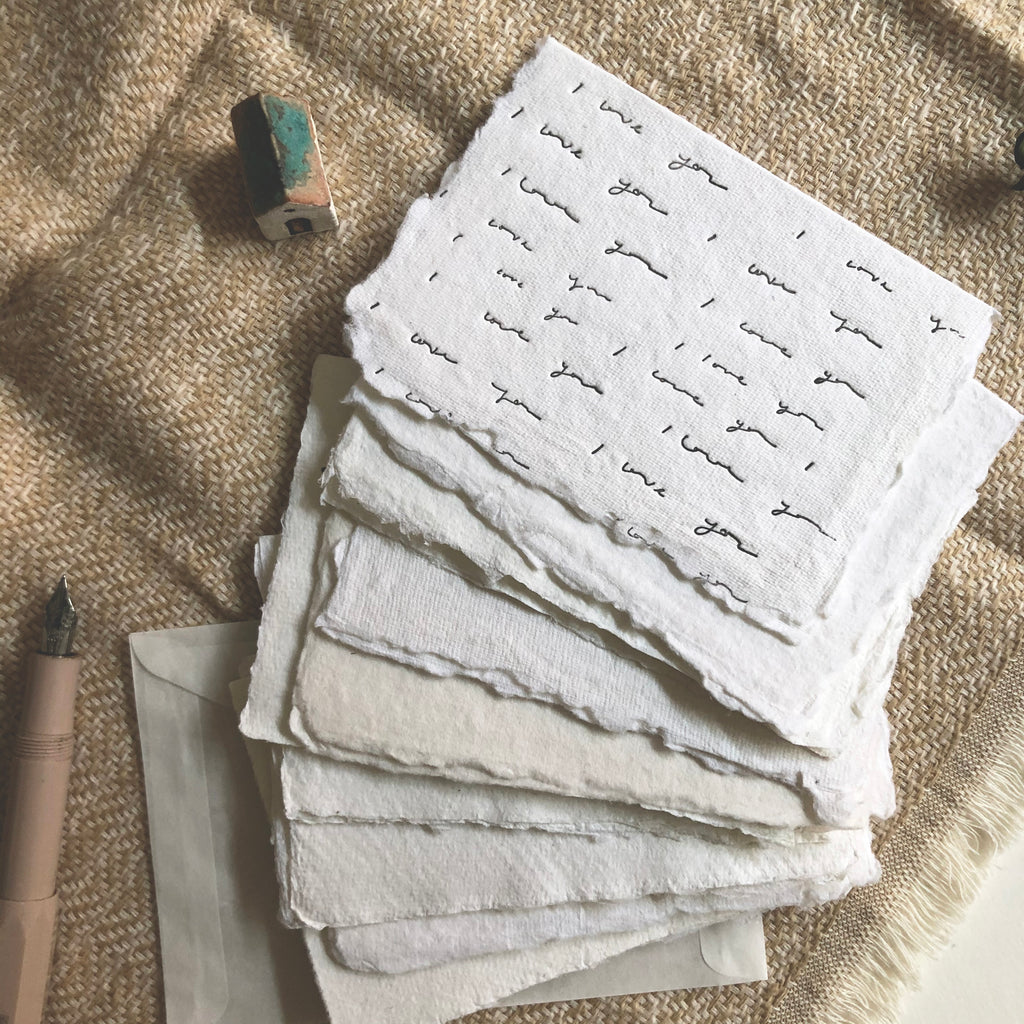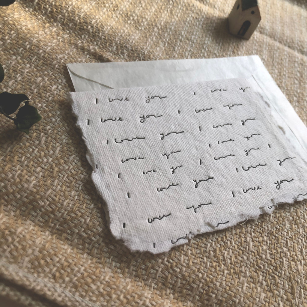 At Belinda Love Lee Paperie, they print each card on 180gsm white handmade paper in house on our antique letterpress here in Toronto. Each card measures to 3 by 4.25 in and comes with a vellum/ glassine semi-transparent envelope. Her designs are all about making subtle, lasting impressions.