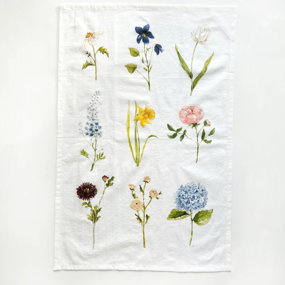 Garden flower illustrations cover the towel making it perfect for washing up, lining a basket, or displaying.