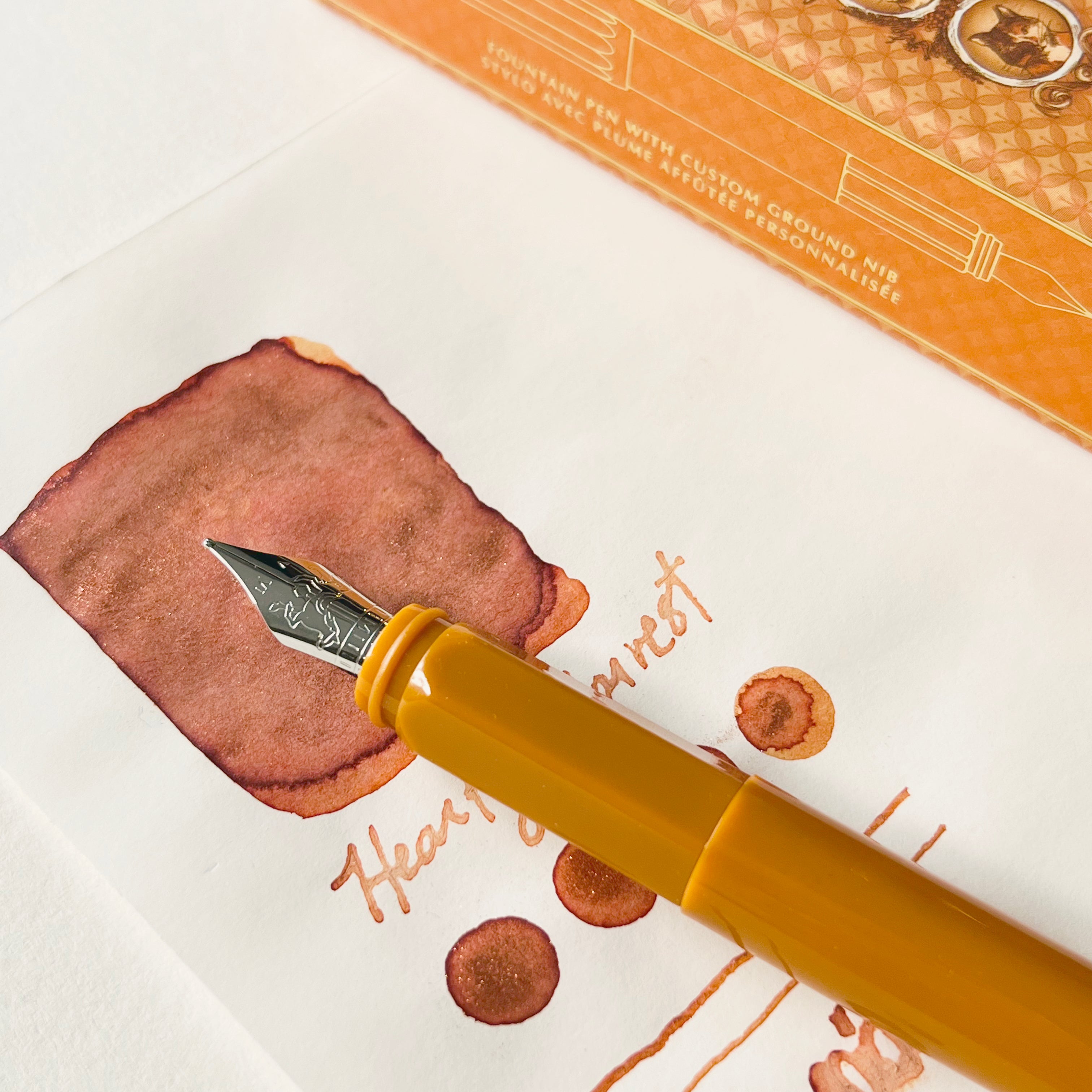 - Fountain Pen Nib: Custom ground steel nib; 0.7mm fine, 1.0mm medium widths
