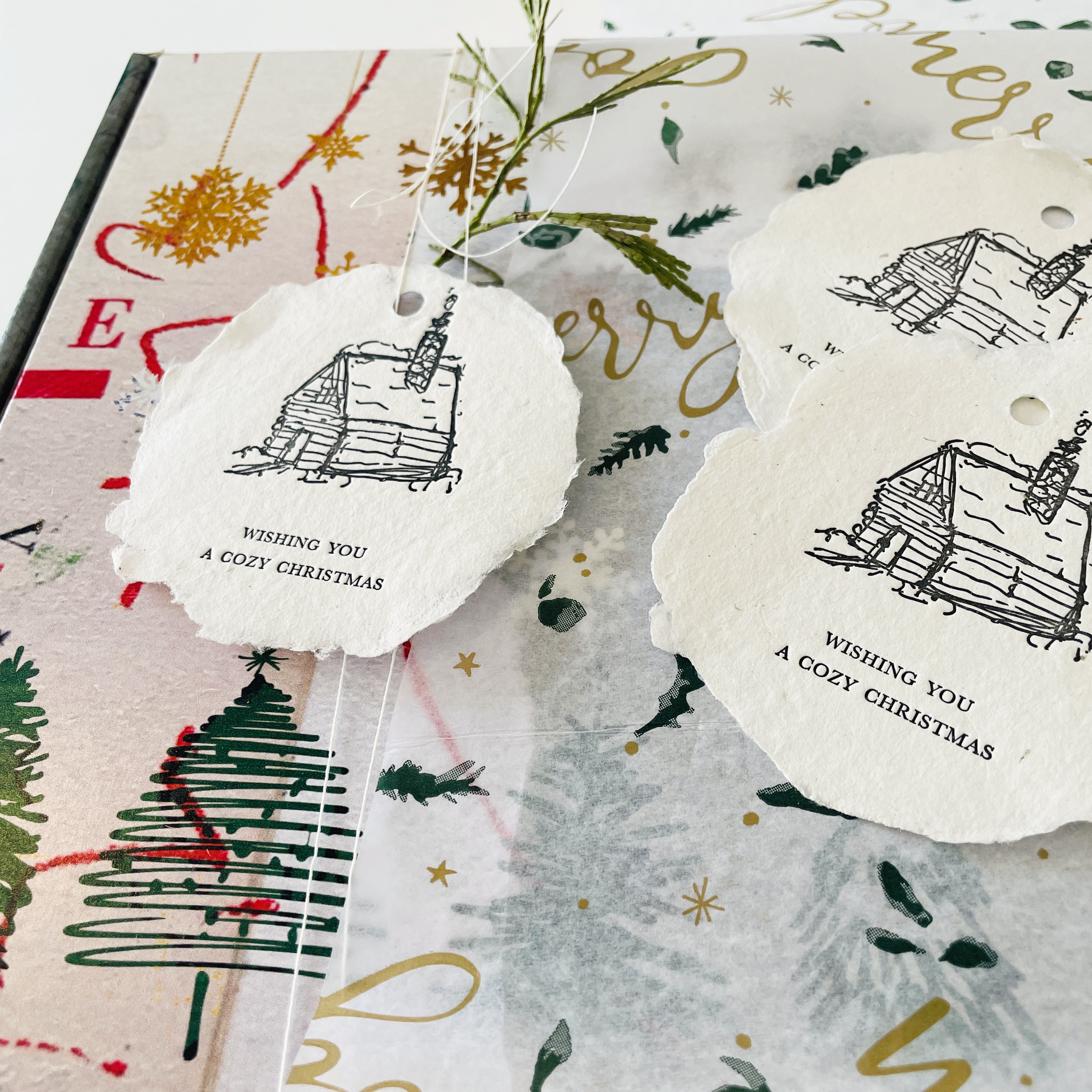 Soft white handmade paper circles with full deckled rounds. Black letterpress printed illustration with a snowy cabin above the words "wishing you a cozy christmas". Finished with botanically-dyed silk ribbon loops in emerald. Available as singles or sets of three. Perfect for thoughtful holiday gifts or to hang on your tree!