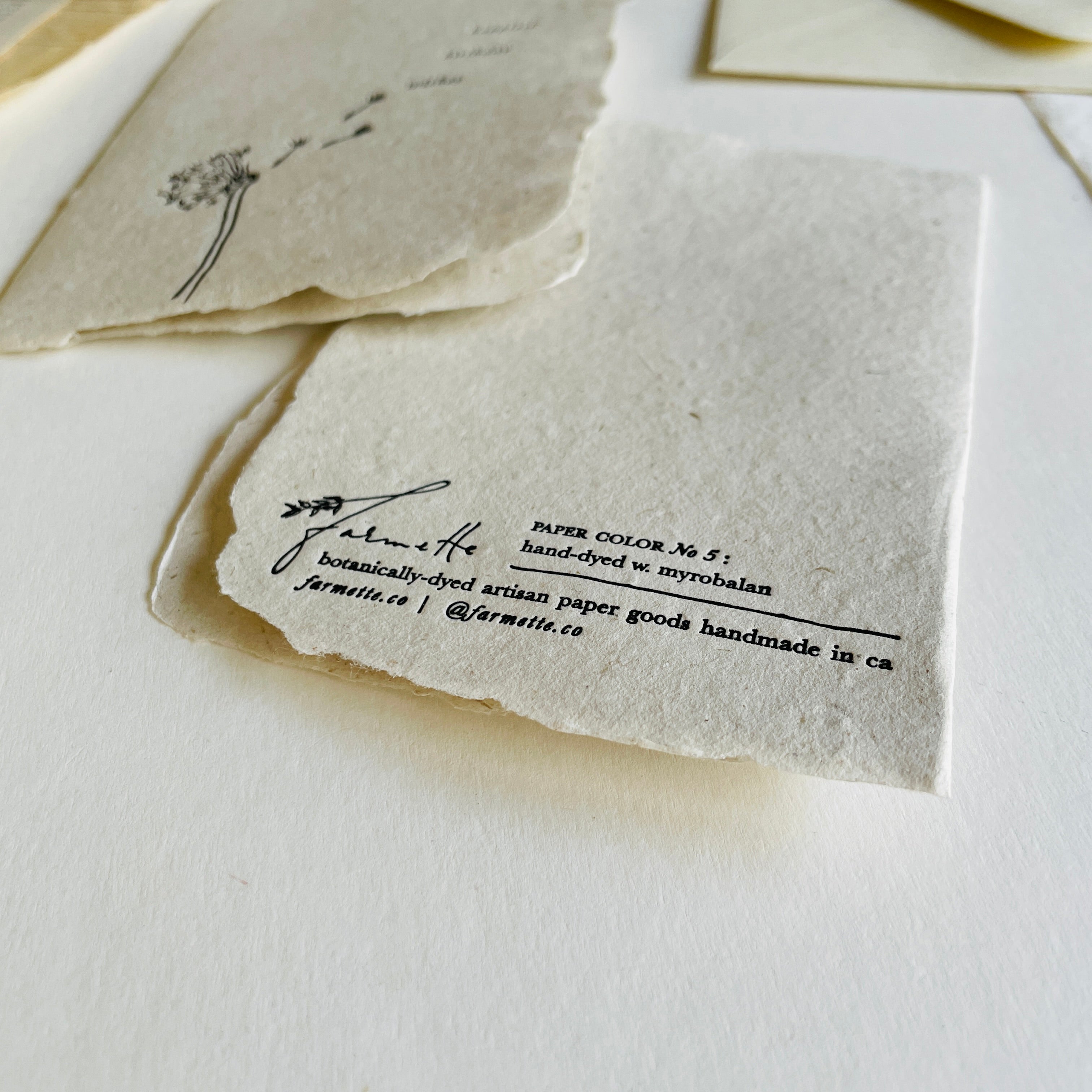 Front is letterpress printed; back is letterpress printed with a small note including information about the natural dyes used to color each unique piece of paper.