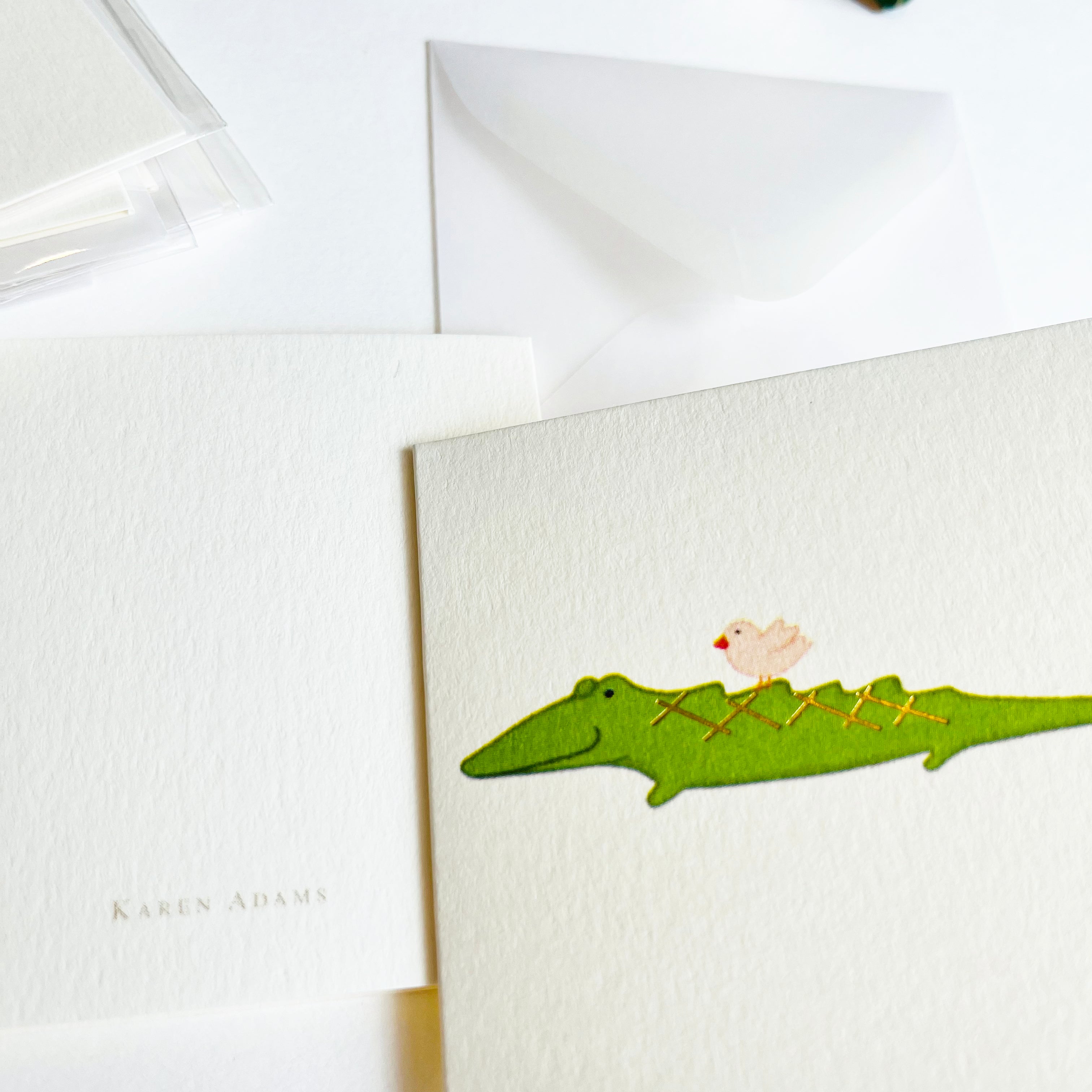 Karen Adams woodland flat notes are printed and foiled in Memphis, TN. Full color ink printed on natural white paper, letterpress printed in silver foil, and paired with natural white envelopes.