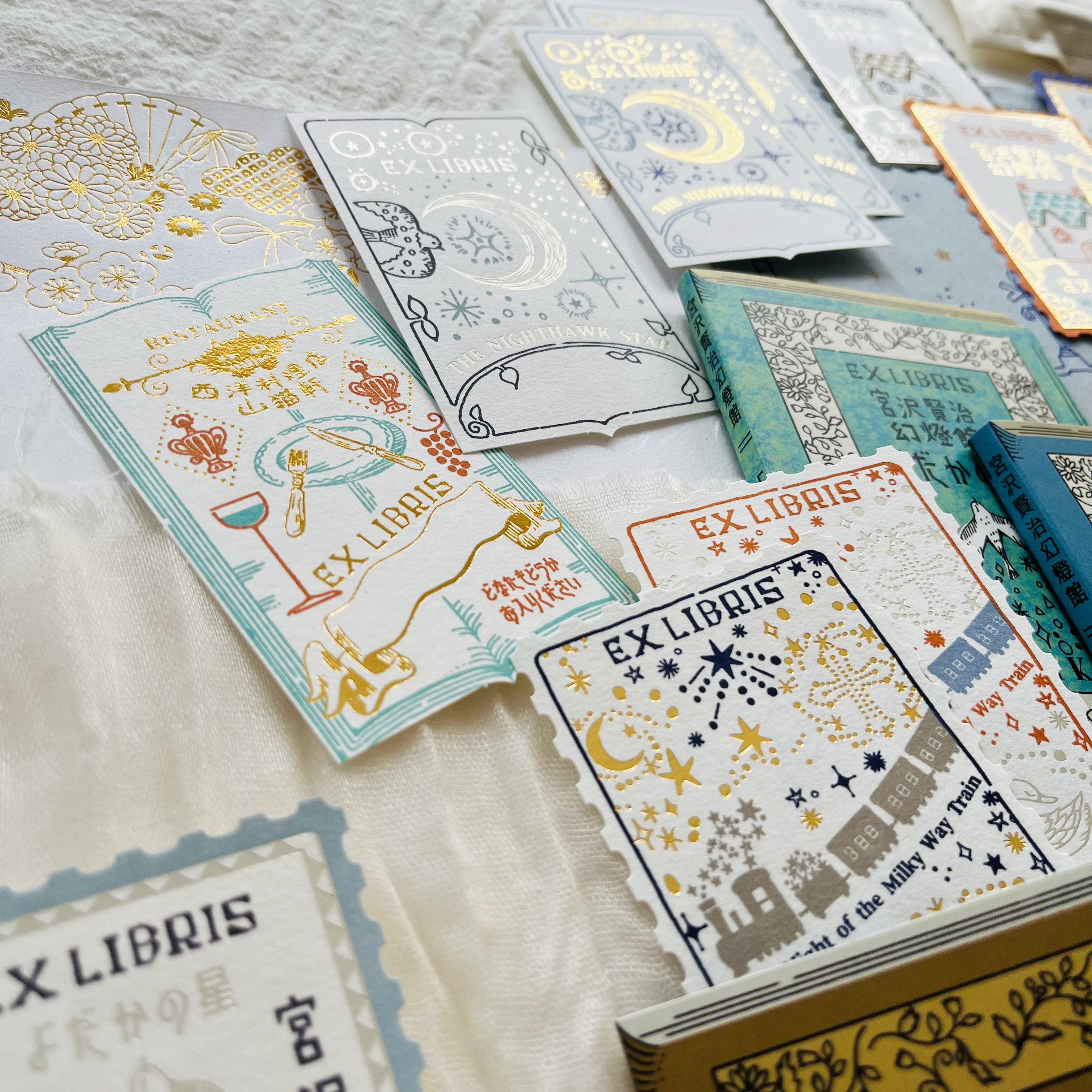 These bookplate stickers, crafted with two-color letterpress printing and luxurious foil stamping, are retro and cute. Shinzi Katoh designed these bookplate-inspired stickers based on the masterpieces of author Miyazawa Kenji. Their retro, nostalgic designs are perfect for stationery lovers .