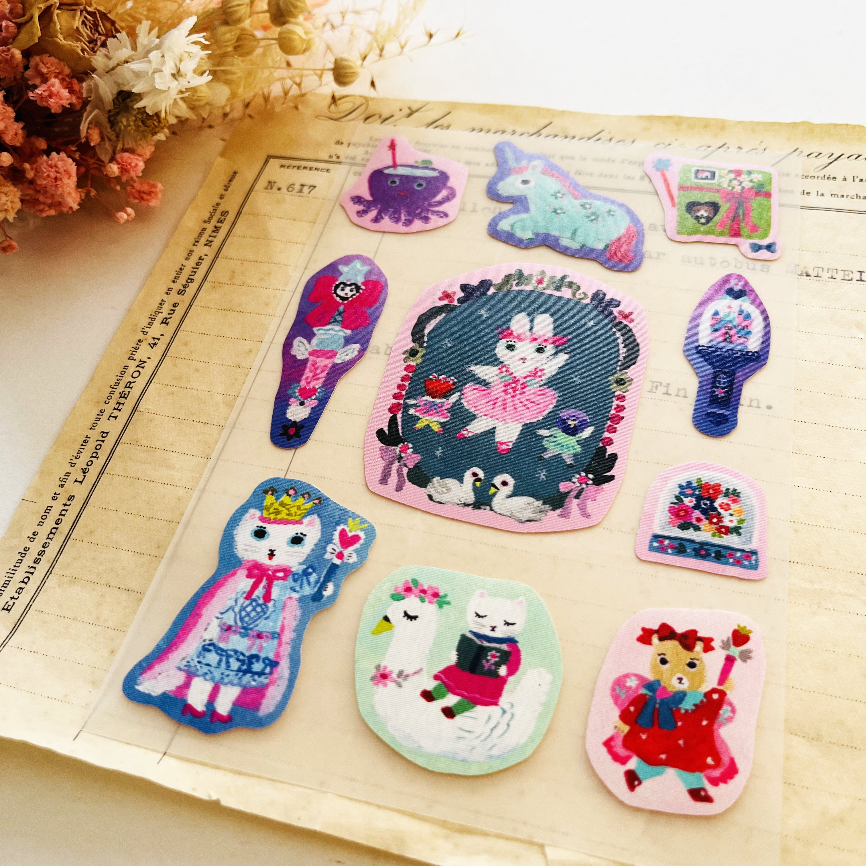Yumi Kitagishi versatile adhesive stickers that stick to clothing, metals, plastics, and more—no ironing needed! Washable on fabric and easy to peel individually. Use them for labeling, decorating, or as stand-alone stickers.