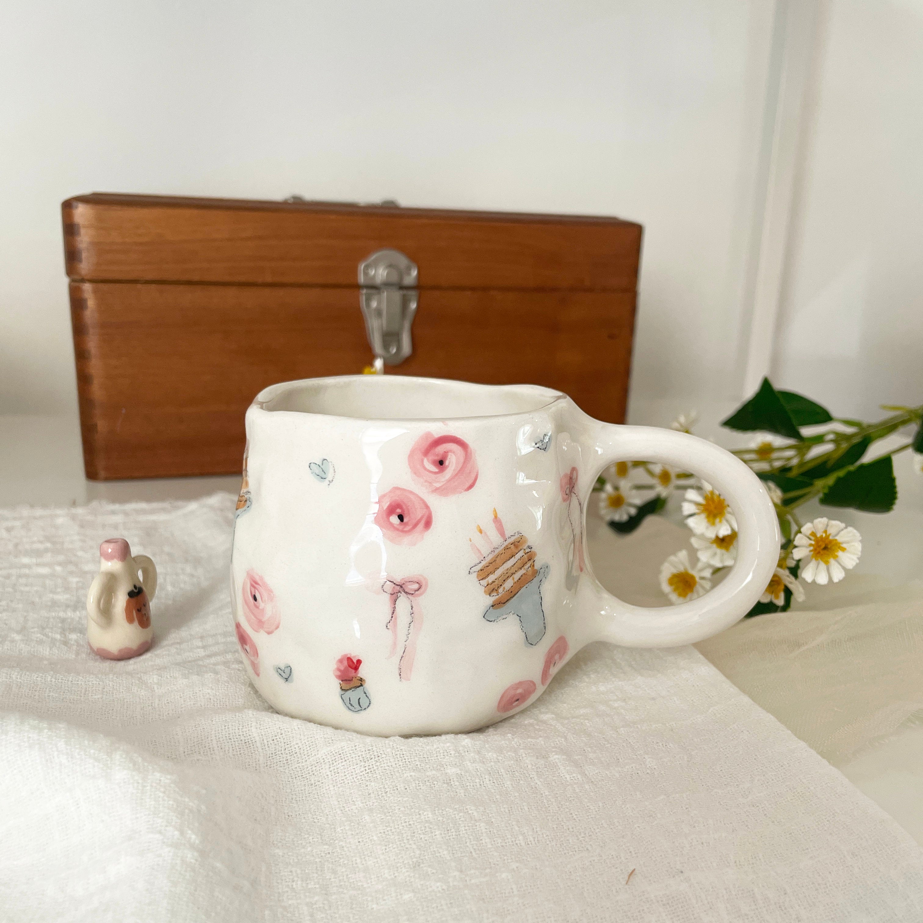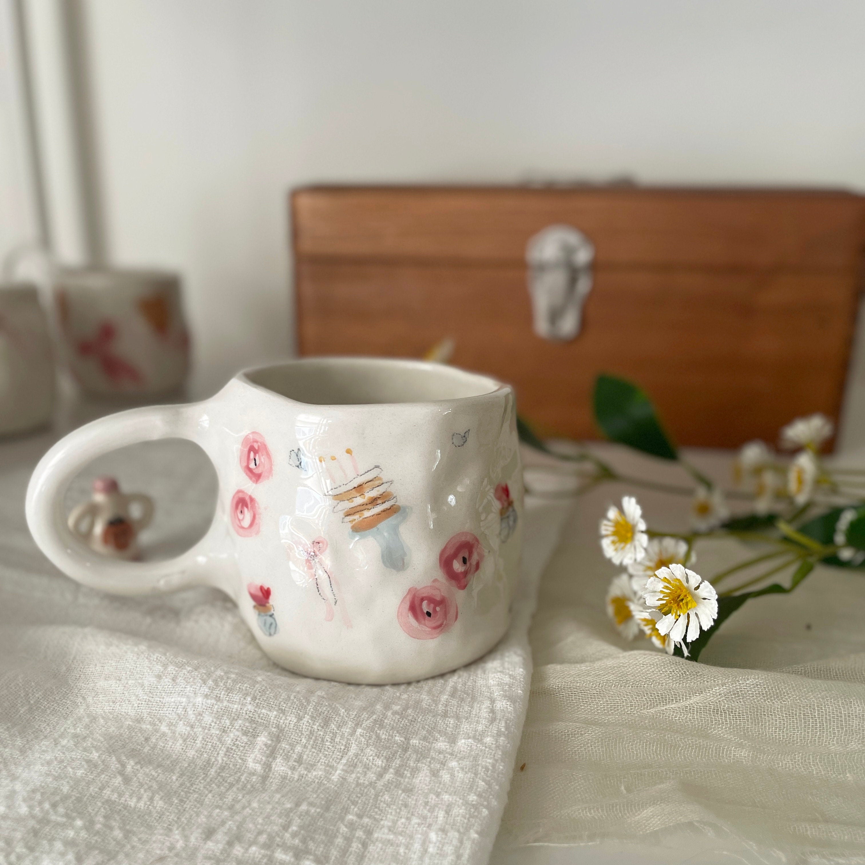 These delightful handmade ceramic mugs created by the talented artist, Qlay. Each mug is crafted with meticulous care and attention, ensuring impeccable quality. And of course, they're hand-painted with an abundance of love too!