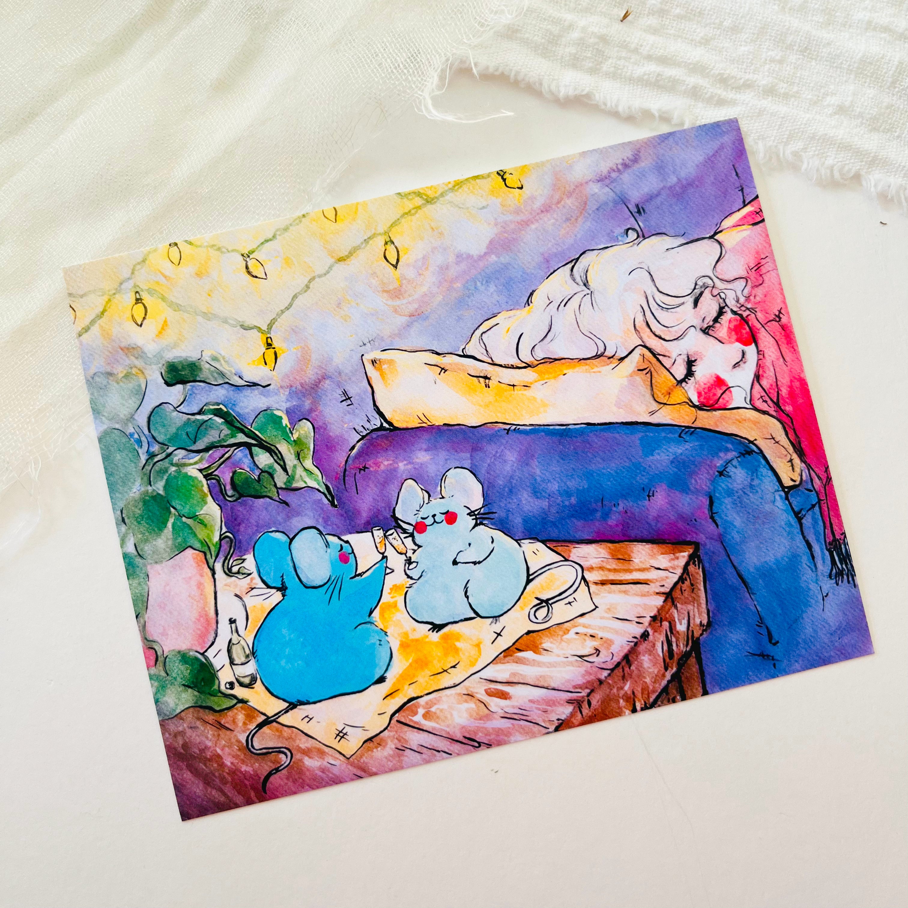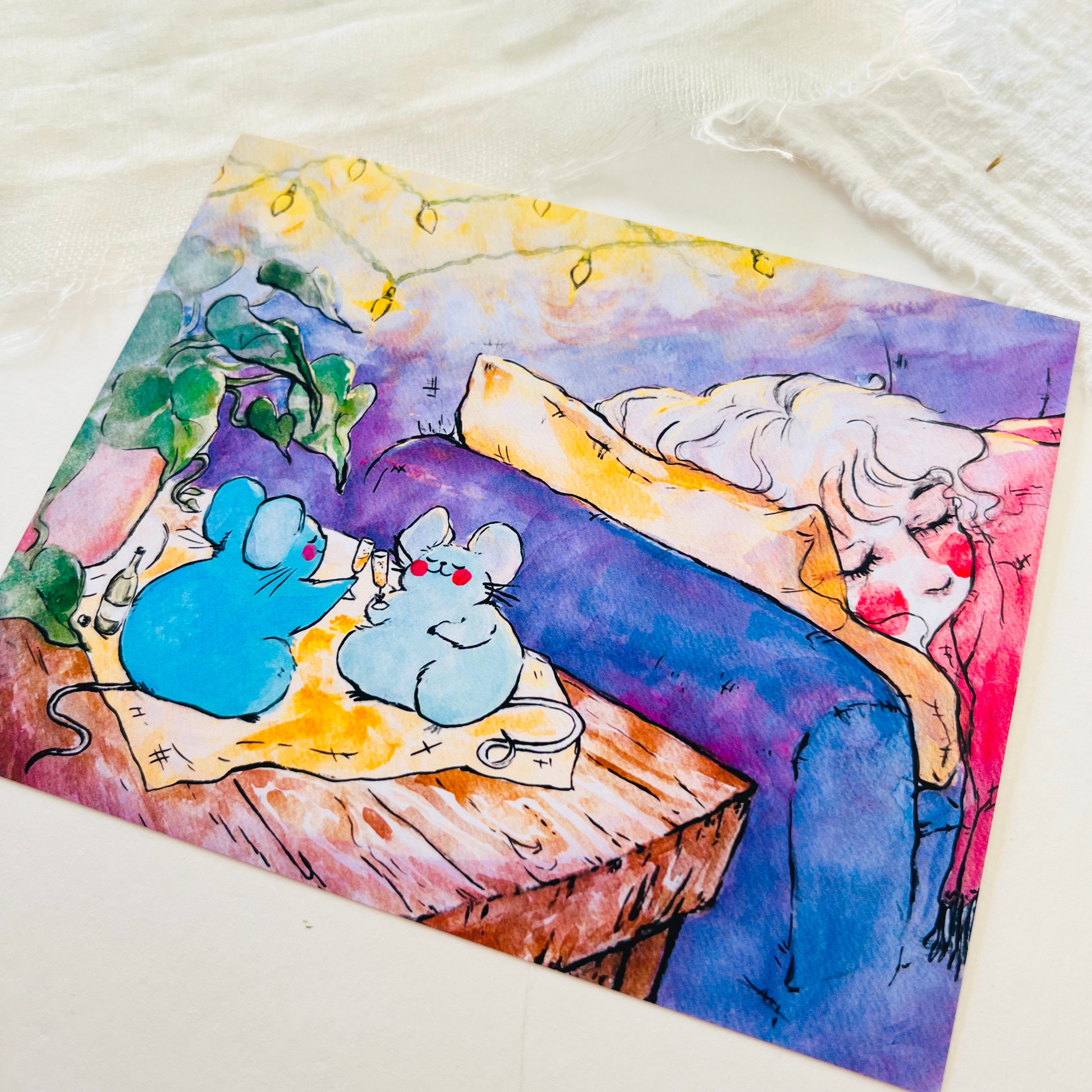 At a glance, they're simply adorable, but take a moment more and you're swept up into a whimsical, storybook world. Rebekah primarily creates her art using watercolor, graphite, and ink on paper. Her pieces showcase endearing animal companions, small narratives, and fleeting moments in life.