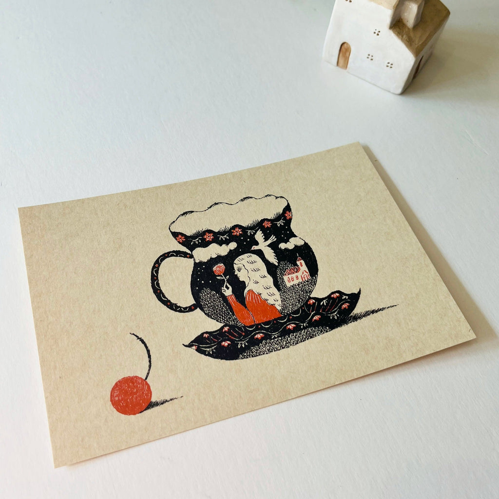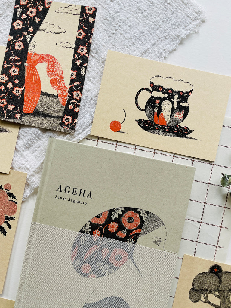 Recently, her interest has turned to using traditional Japanese black and orange inks. This process uses fine pen work to create beautifully detailed pieces. Sanae’s narrative illustrations are mainly inspired by authors and often include imagery of girls, flowers and animals.