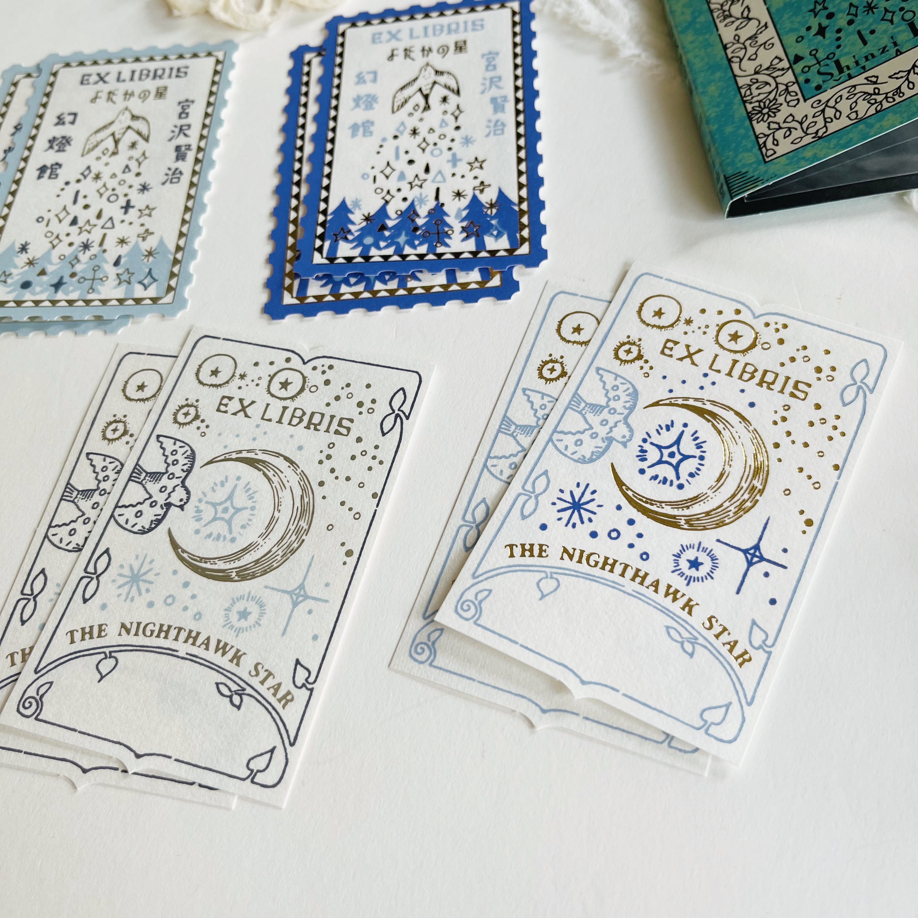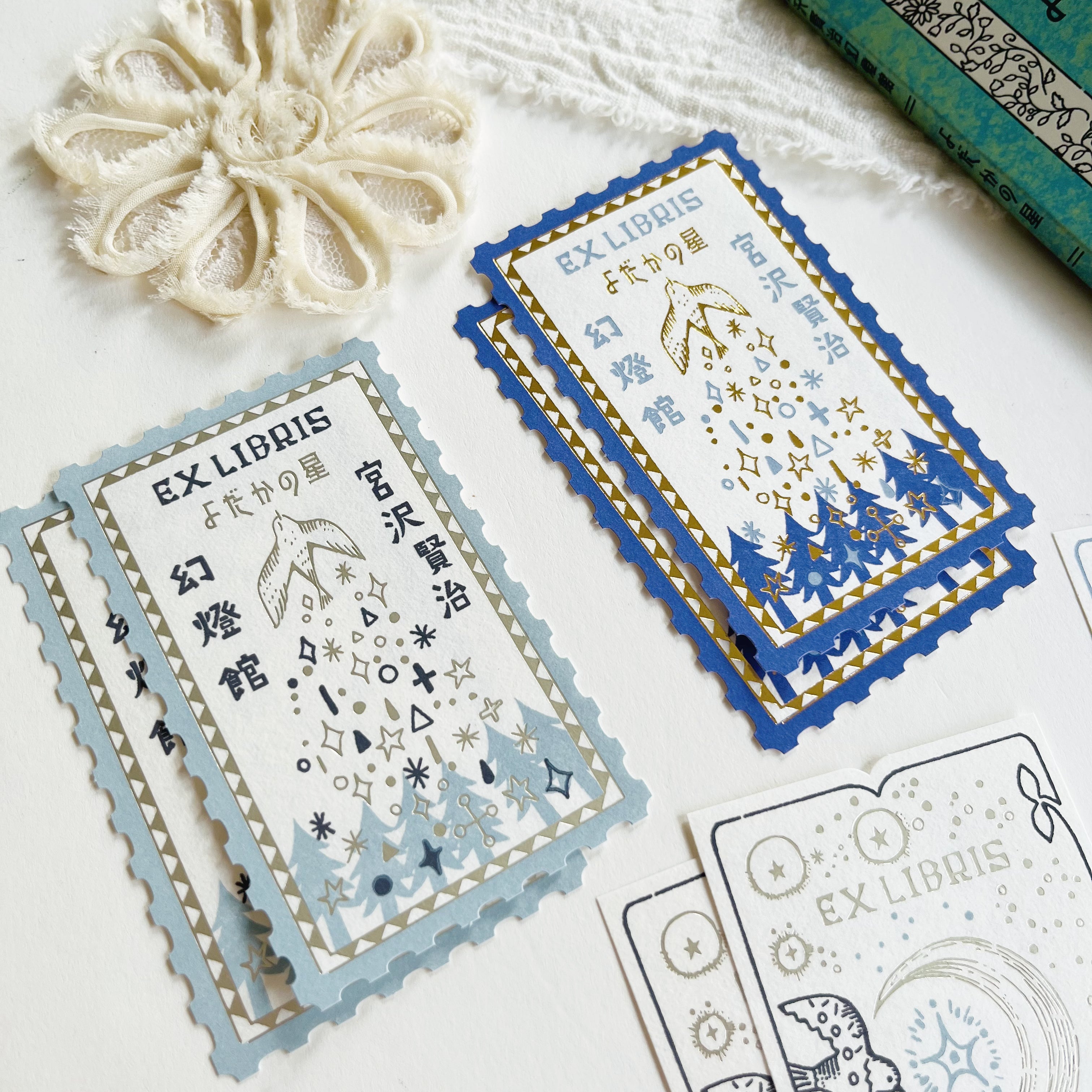 These bookplate stickers, crafted with two-color letterpress printing and luxurious foil stamping, are retro and cute. Shinzi Katoh designed these bookplate-inspired stickers based on the masterpieces of author Miyazawa Kenji. Their retro, nostalgic designs are perfect for stationery lovers .