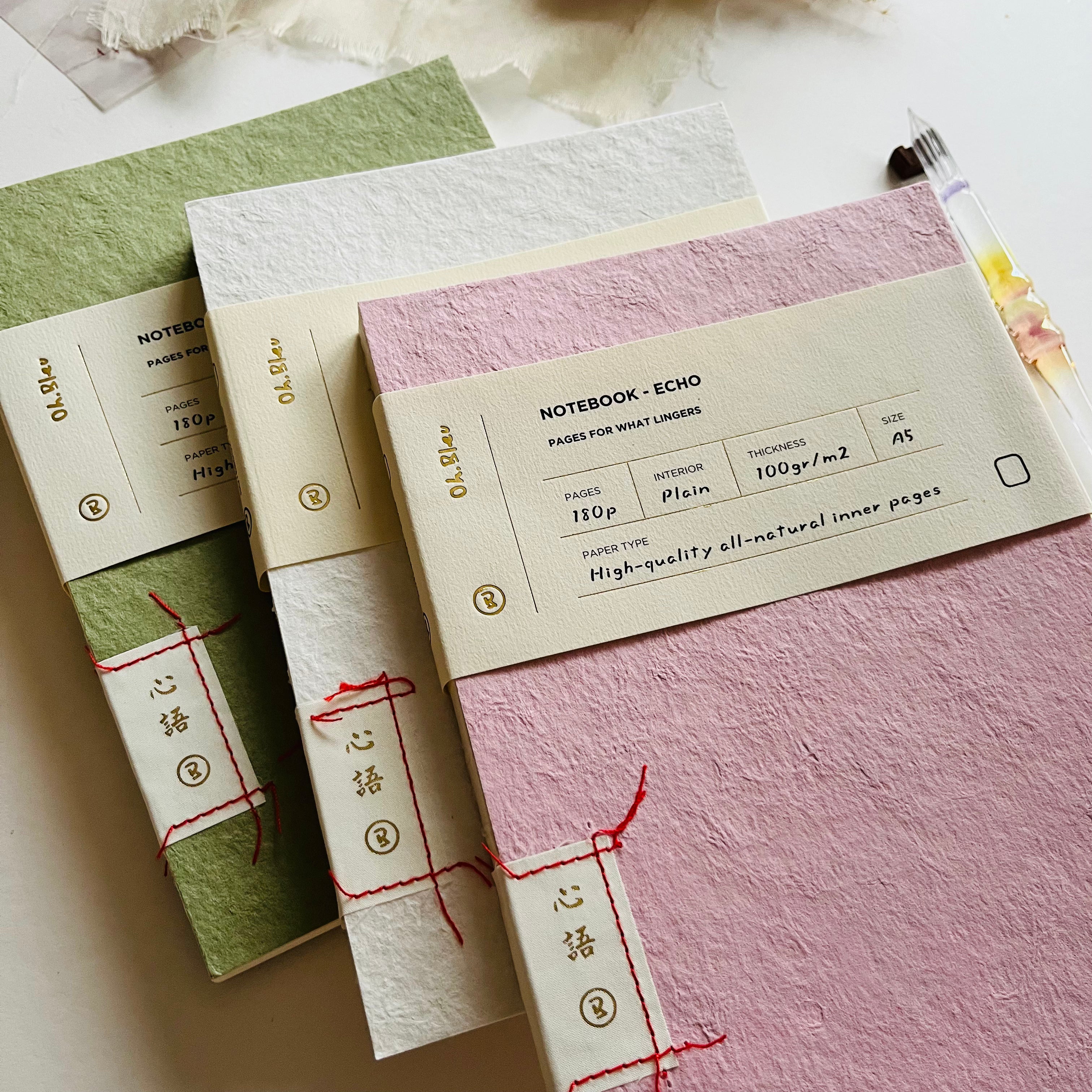 A paper label bearing the gold-printed characters 心語 — “ words from the heart” — adds a quiet, personal detail, lending each notebook its own distinctive character.