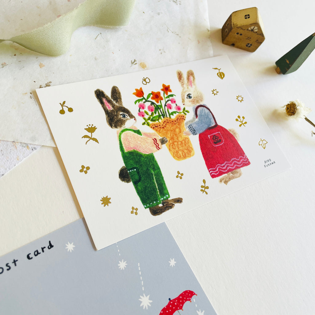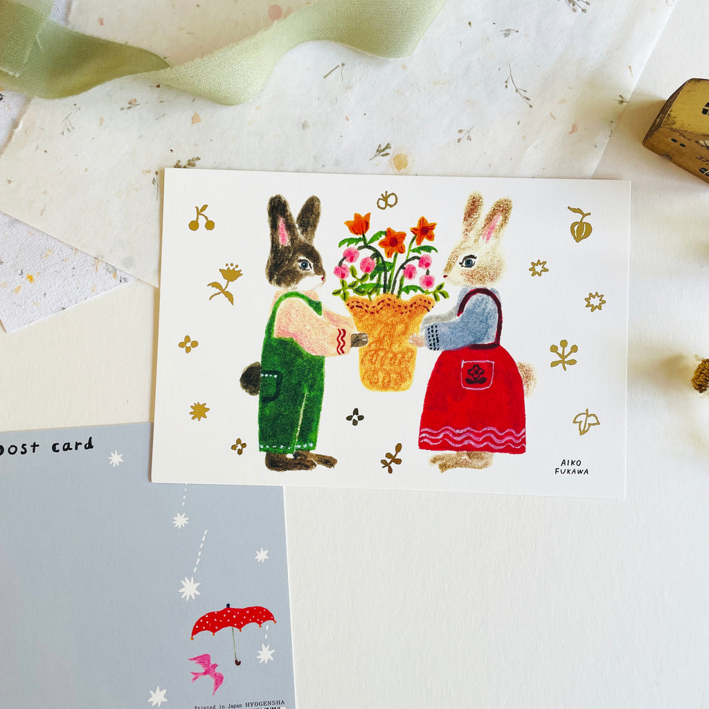 This lovely postcard illustrated by the beloved Japanese artist, Aiko Fukawa. Her incredible talent shines through in vibrant, cozy, and heartwarming illustrations for ads, book covers, stationery, magazines, and children's books. She's all about animals and nature, often turning them into the main characters of her enchanting stories.