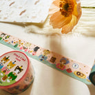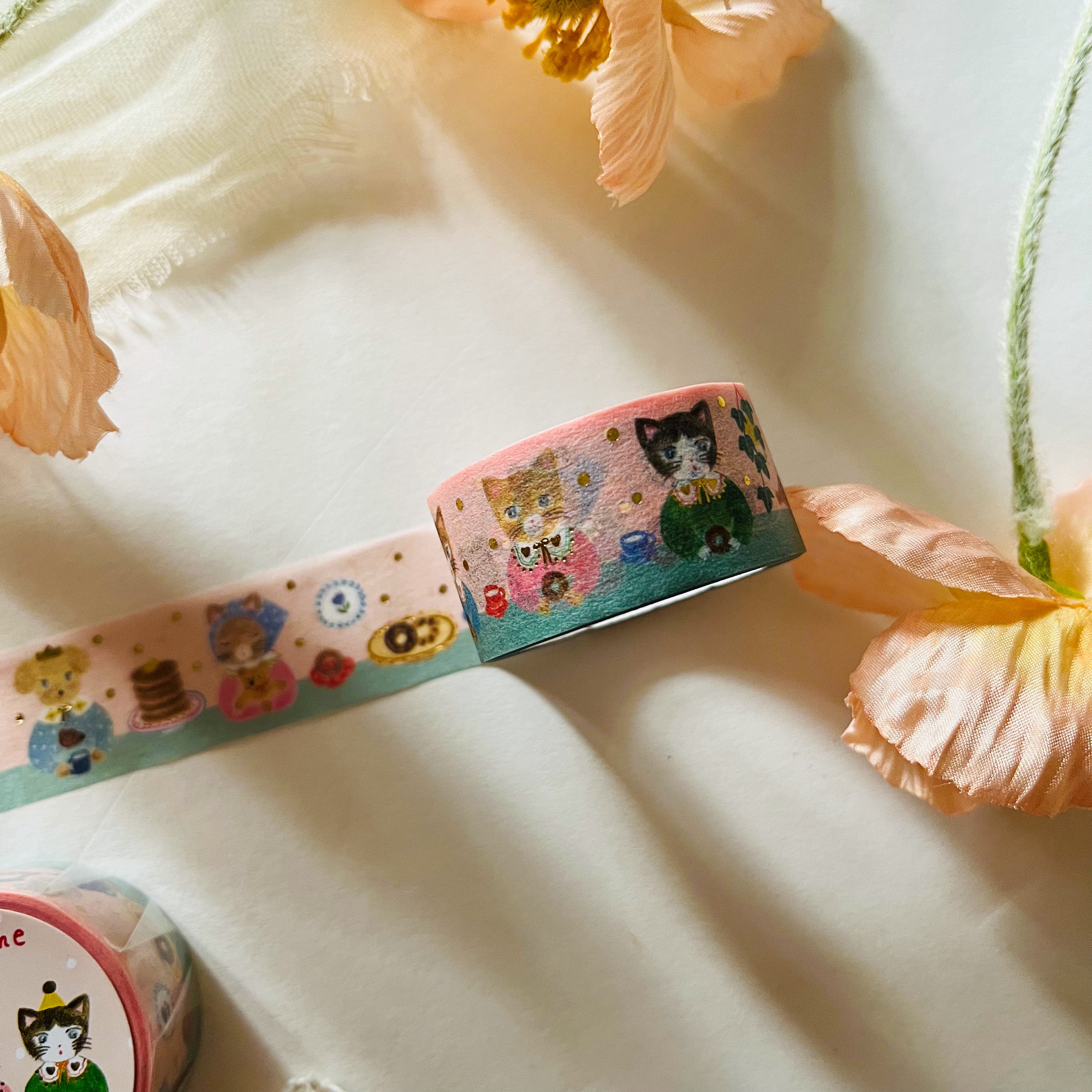 This masking tape by illustrator Aiko Fukawa. It's time for the long-awaited snack. The animals eating donuts and pancakes are drawn in a very cute style. Everyone's expressions are charming The glittering gold foil accents the tape.