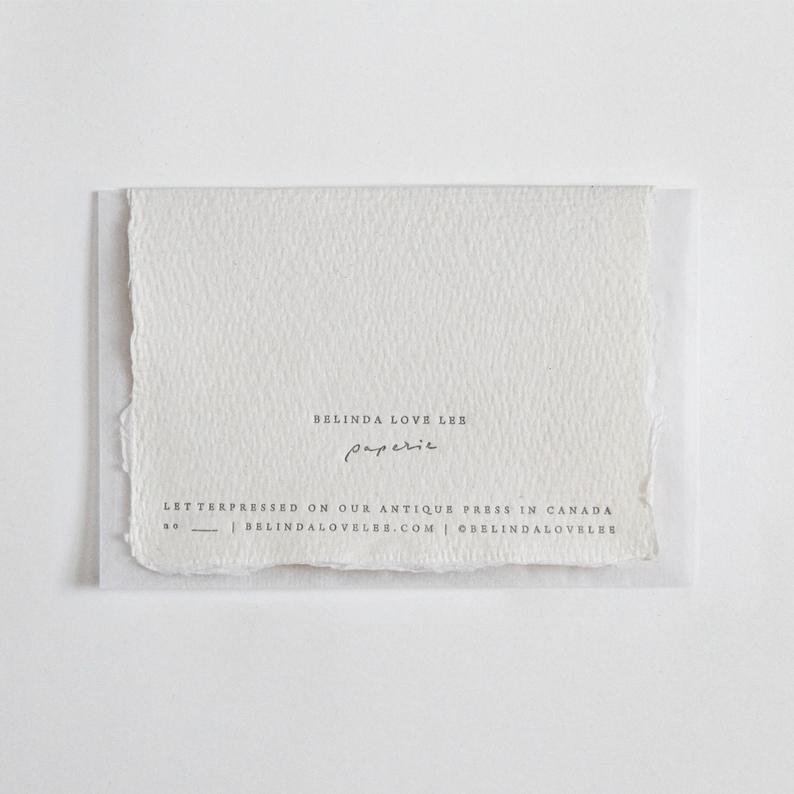 At Belinda Love Lee Paperie, they print each card on 180gsm white handmade paper in house on our antique letterpress here in Toronto. Each card measures to 3 by 4.25 in and comes with a vellum/ glassine semi-transparent envelope. Her designs are all about making subtle, lasting impressions.