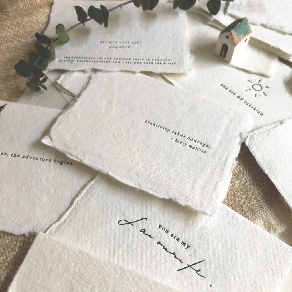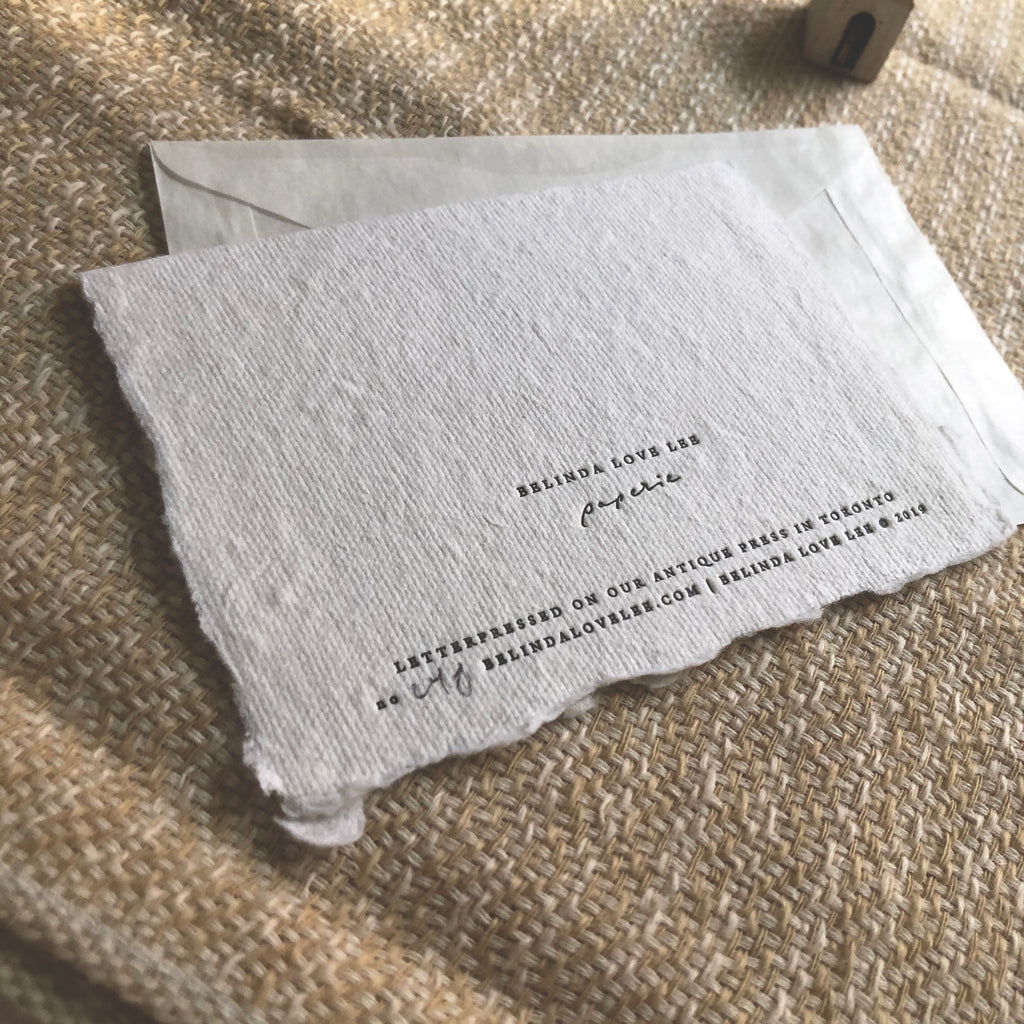 At Belinda Love Lee Paperie, they print each card on 180gsm white handmade paper in house on our antique letterpress here in Toronto. Each card measures to 3 by 4.25 in and comes with a vellum/ glassine semi-transparent envelope. Her designs are all about making subtle, lasting impressions.