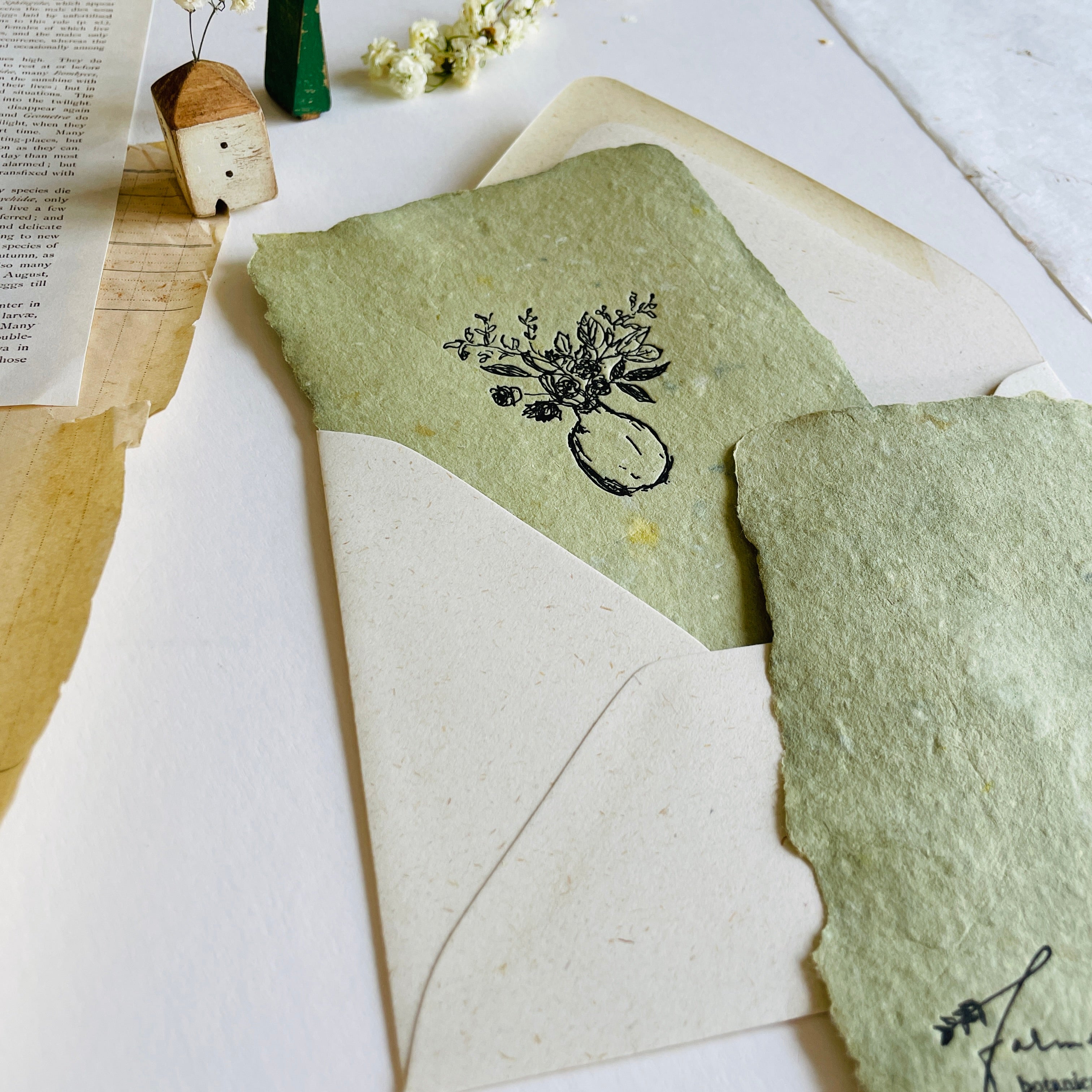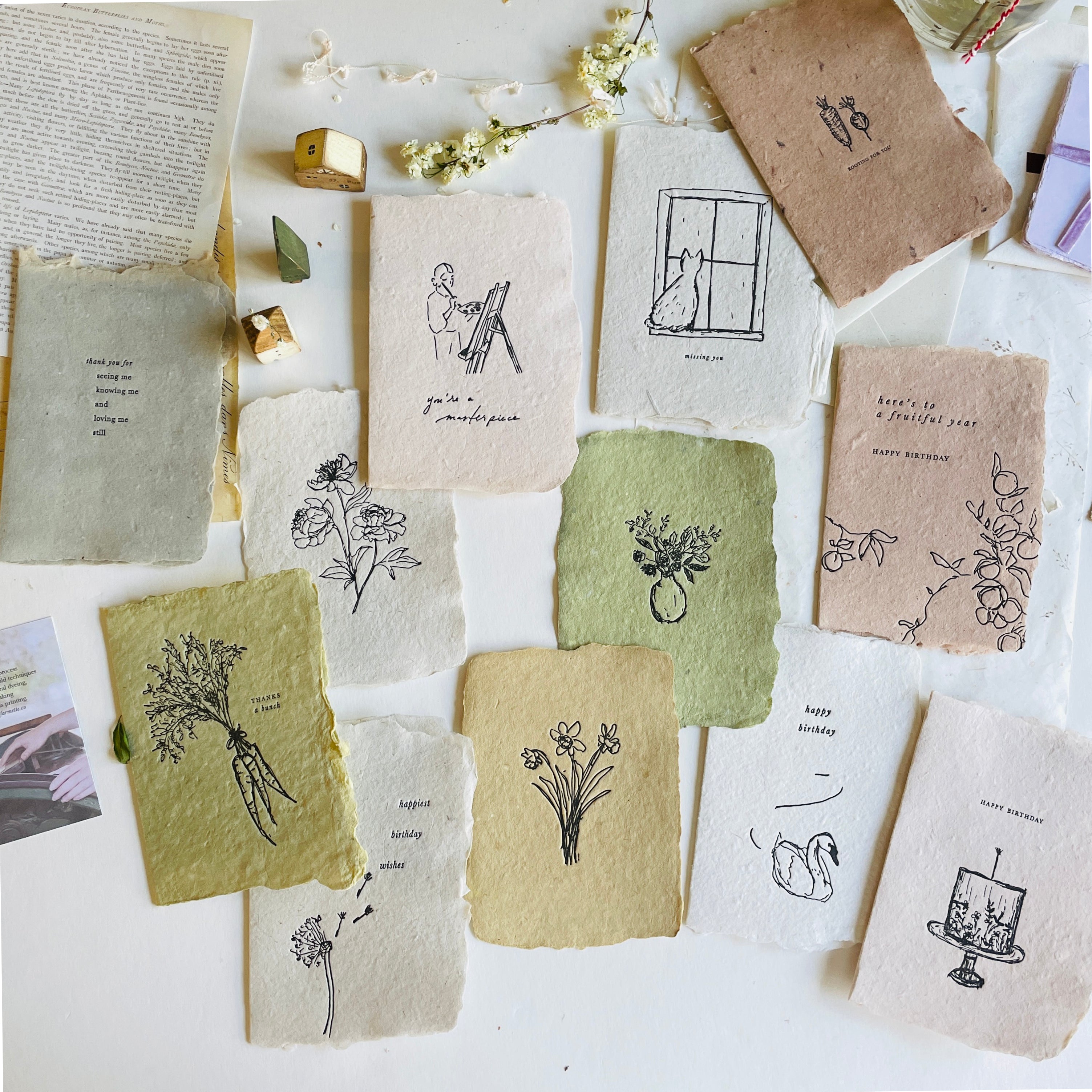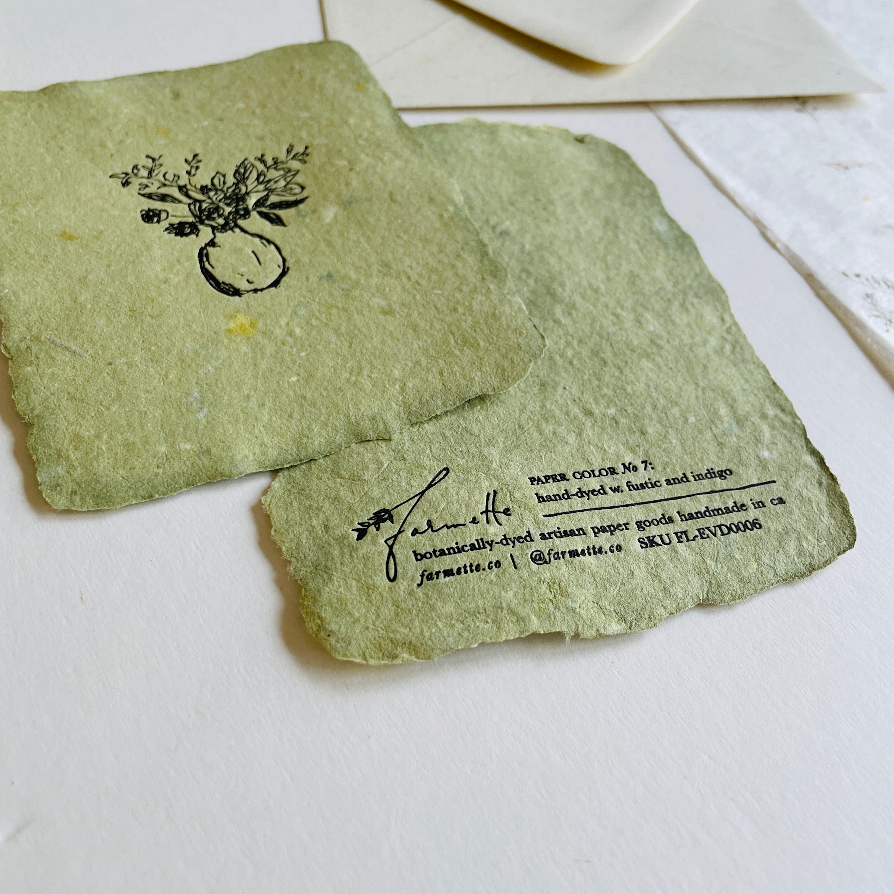 Comes with a textured, harvest white A2 envelope and a small card matte printed with photos and a little information about Farmette's process.