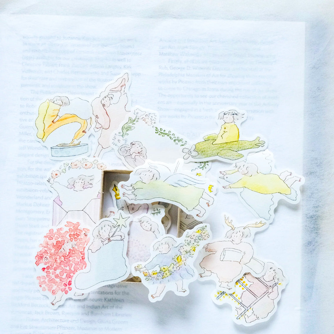 Box of 18 illustrations, 36 die-cut stickers.