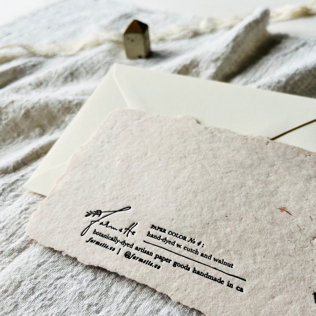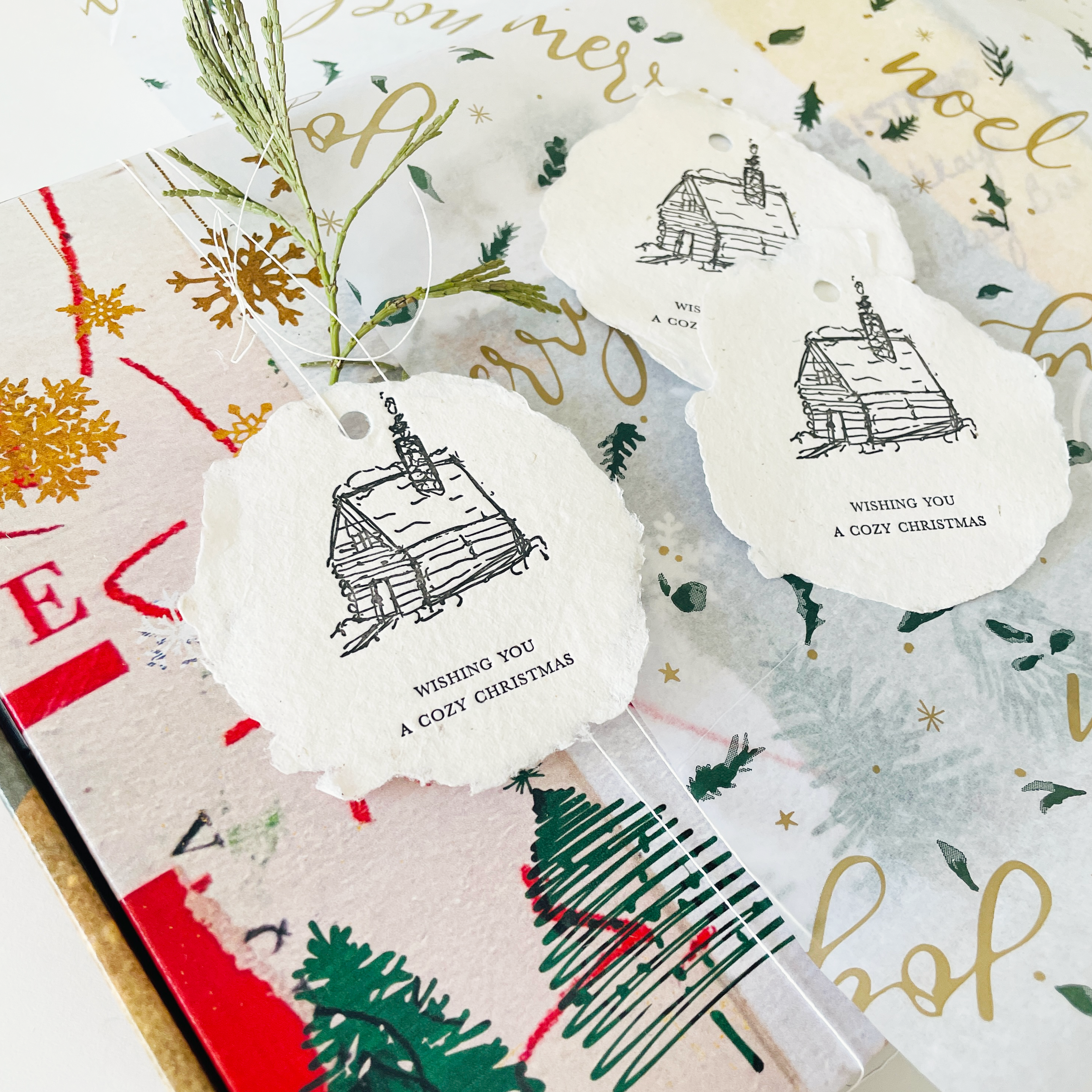 Soft white handmade paper circles with full deckled rounds. Black letterpress printed illustration with a snowy cabin above the words "wishing you a cozy christmas". Finished with botanically-dyed silk ribbon loops in emerald. Available as singles or sets of three. Perfect for thoughtful holiday gifts or to hang on your tree!