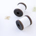 The reclaimed bobbins were used in weaving mills in Austria and the US for the manufacturing of fine silks. Each of them comes with its own history. The tops and bottoms of the bobbins have various colours (red/dark blue/green/black/brown-beige) and are all about the same size (4.9 in x 3in (12,5cm x 7,5cm)) and each bobbin has a very good condition.