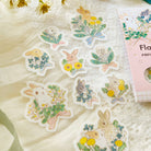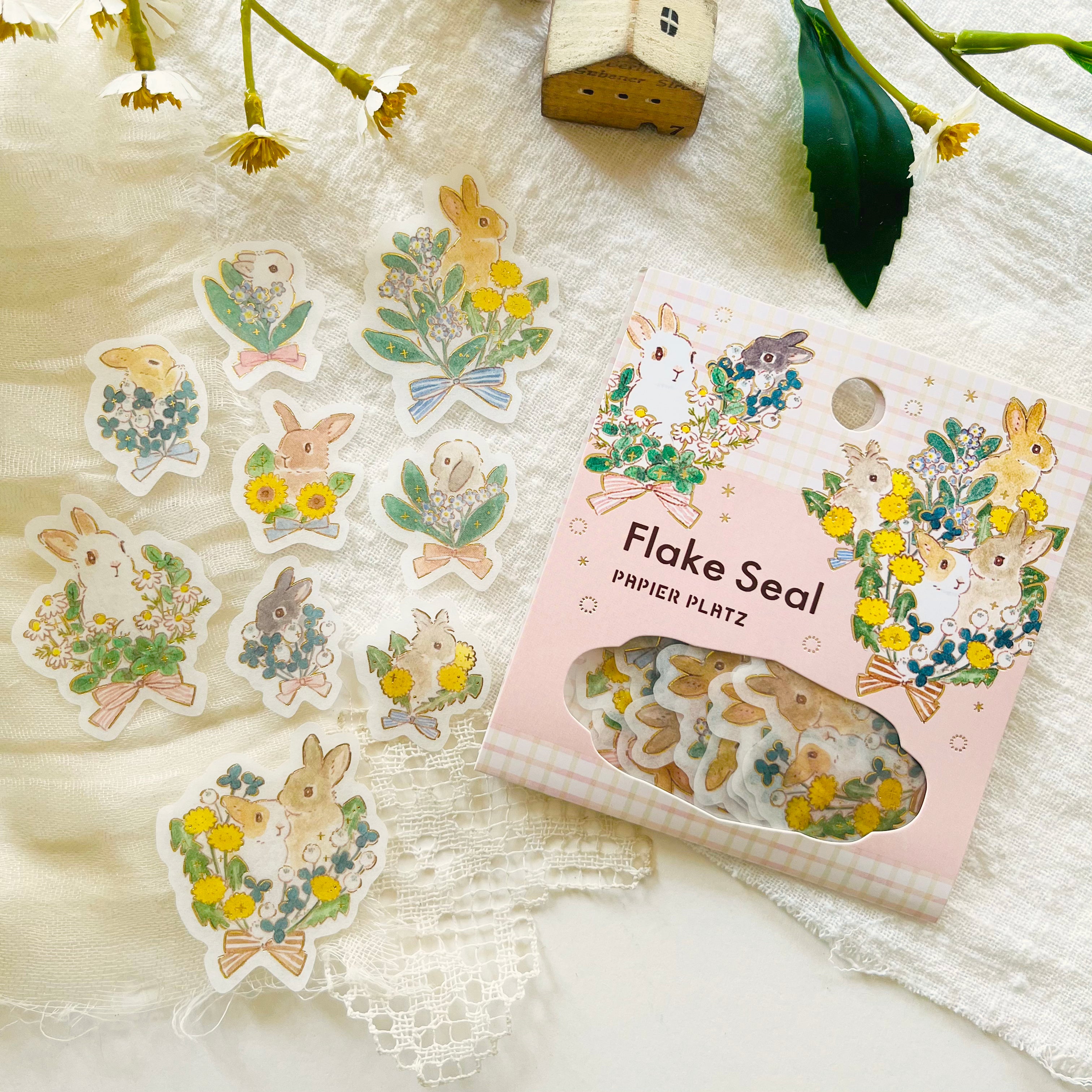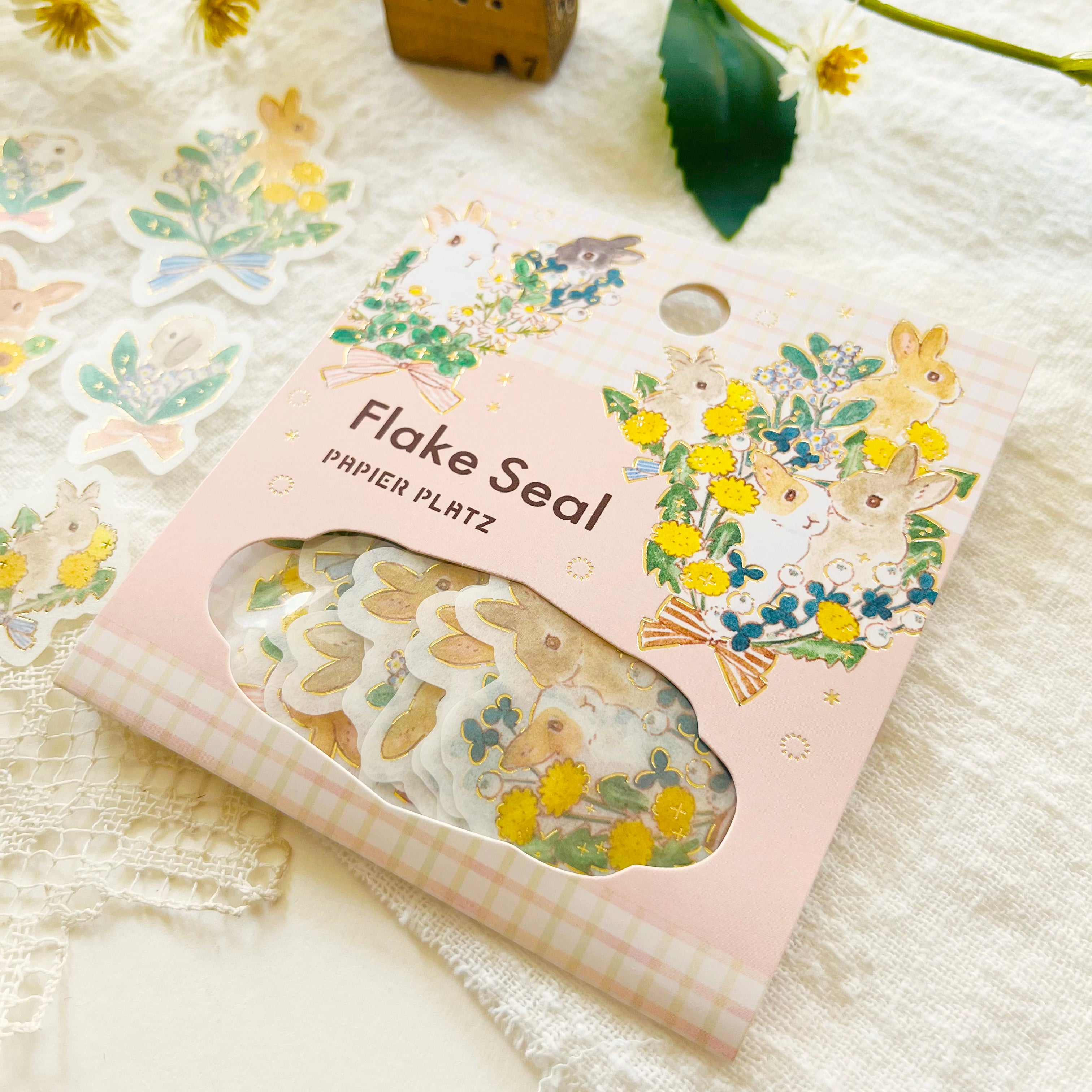 Gold foil stamped flake stickers by illustrator Motoko Moriyama, featuring illustrations of bunnies.