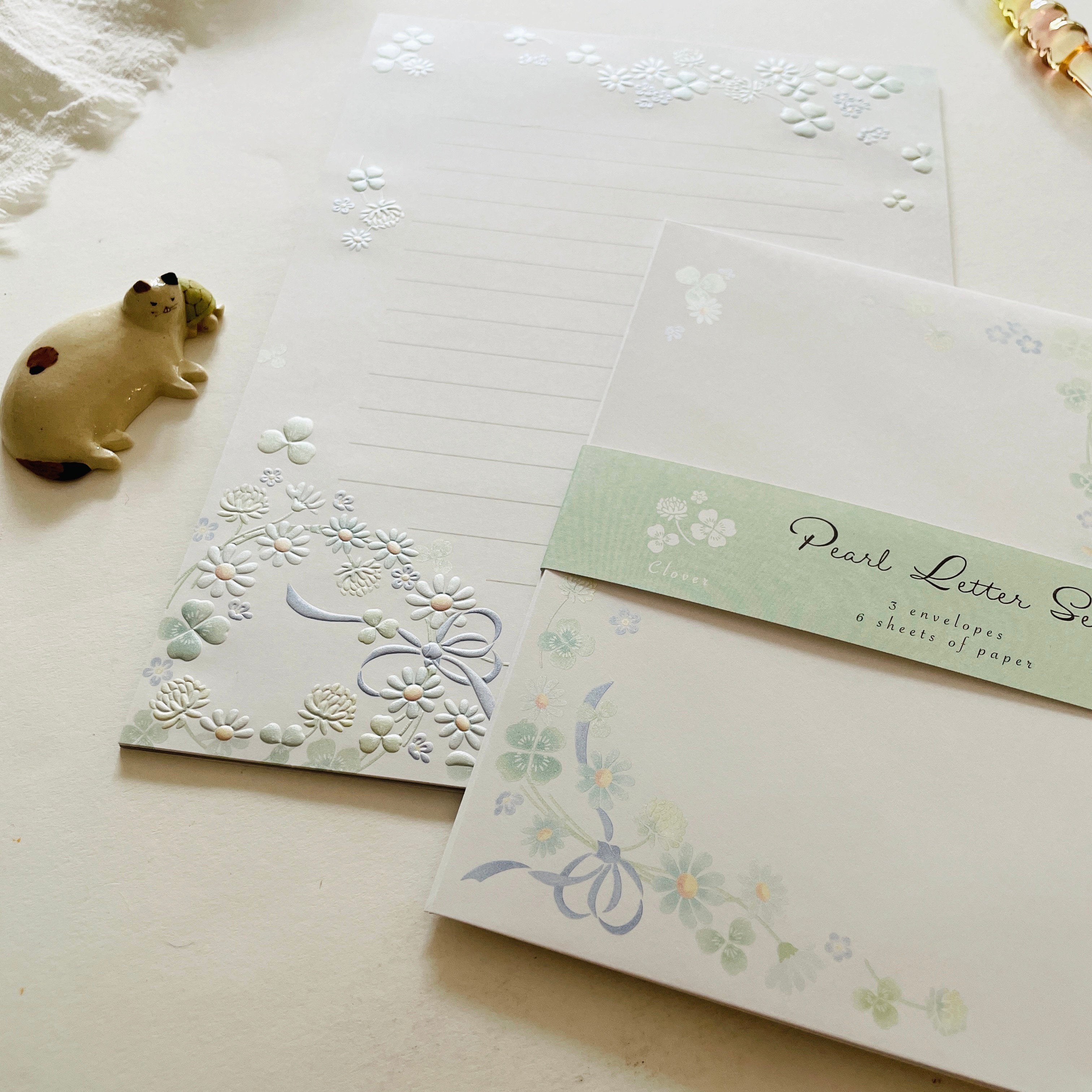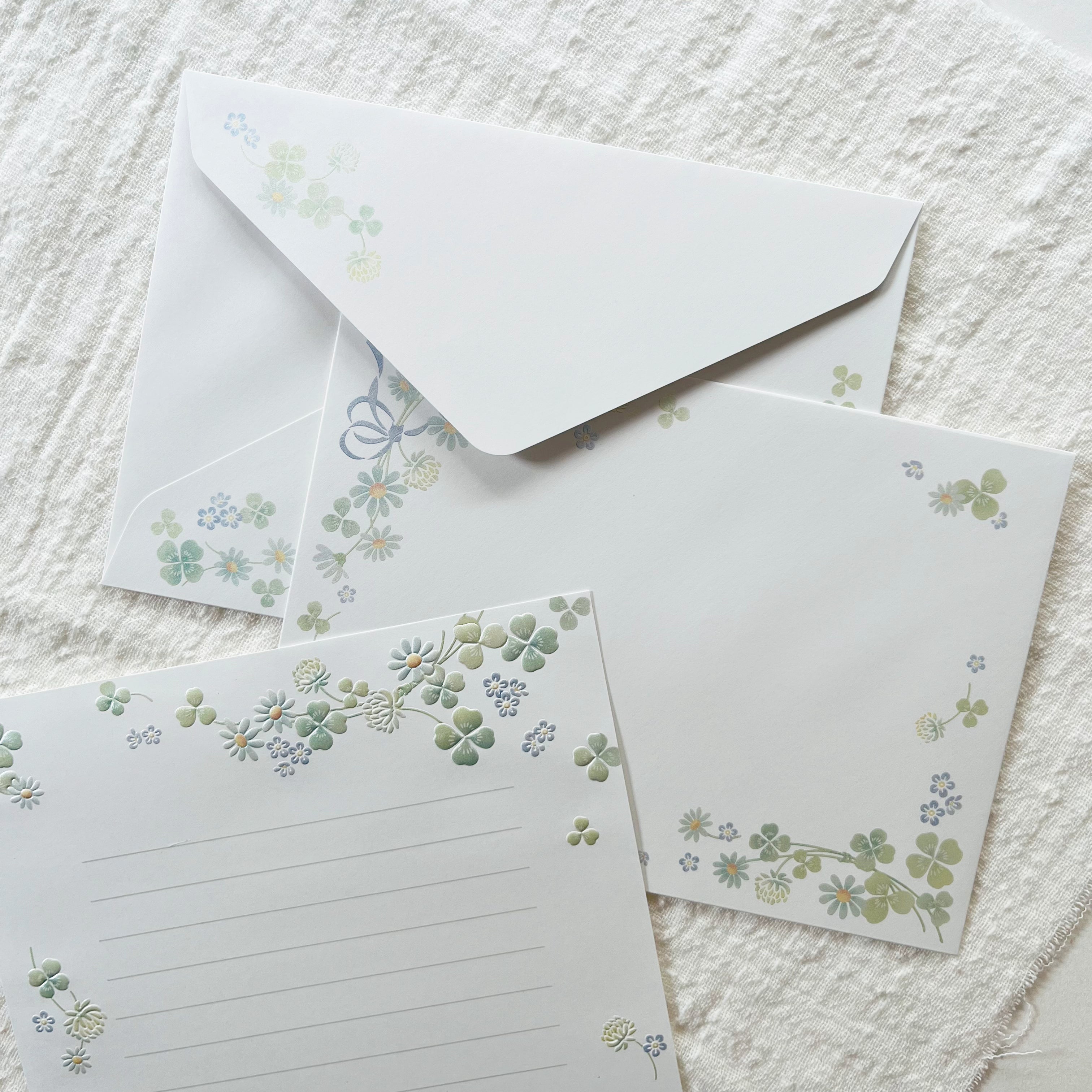 This A5 letter set features a subtle pearl shine and embossed letterheads. The clover and pale blue flowers provide a gentle, easy-to-use design.