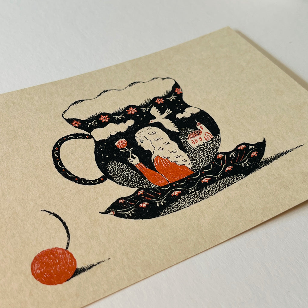 Recently, her interest has turned to using traditional Japanese black and orange inks. This process uses fine pen work to create beautifully detailed pieces. Sanae’s narrative illustrations are mainly inspired by authors and often include imagery of girls, flowers and animals.