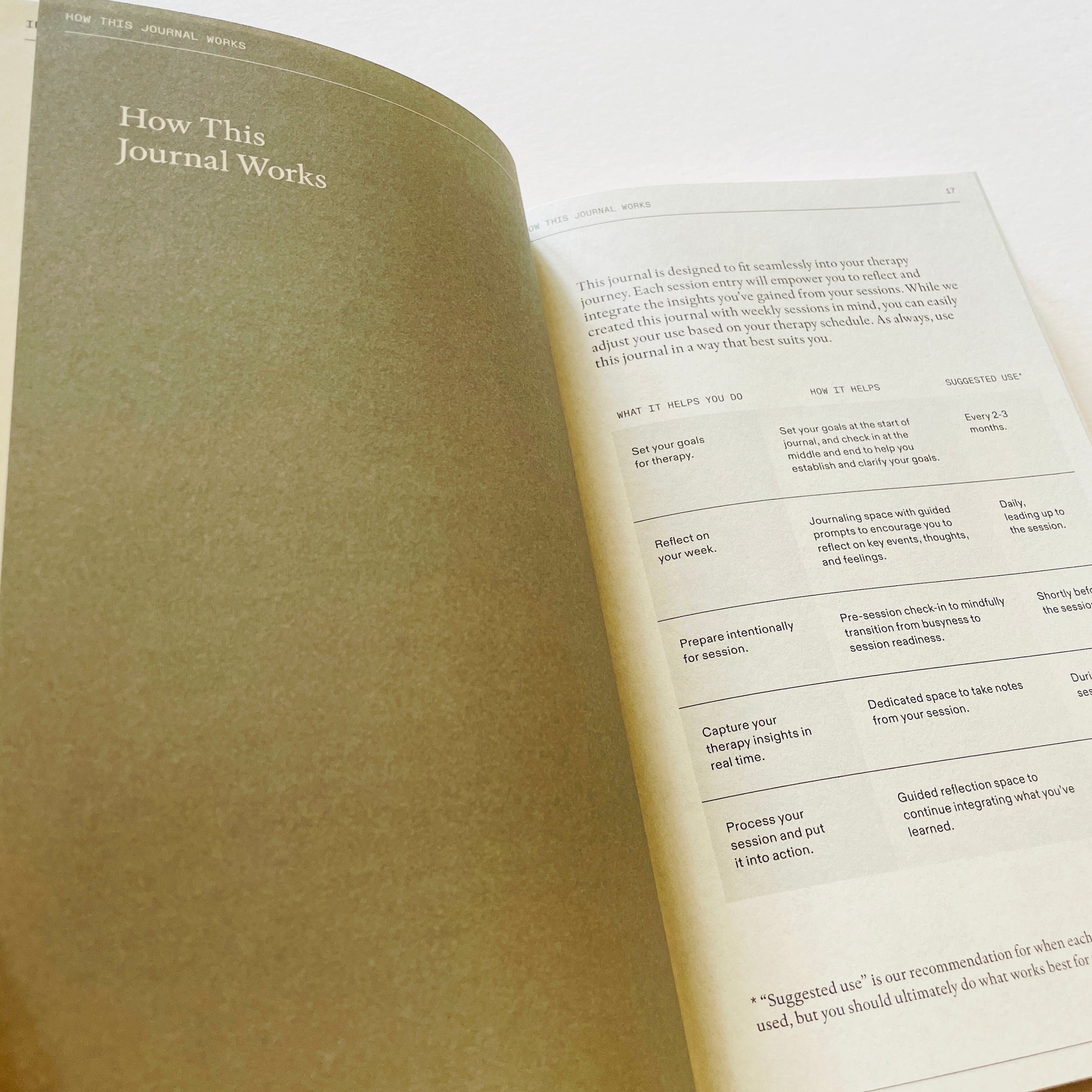 Be the co-pilot of your therapy sessions and capture insights that lead to progress in the therapy journal. With 20 session entries and 70+ prompts, this notebook equips you with the structure and space to get the most out of your sessions. You'll organize your thoughts to prepare for sessions, keep track of insights, and be empowered as an active participant of your growth journey