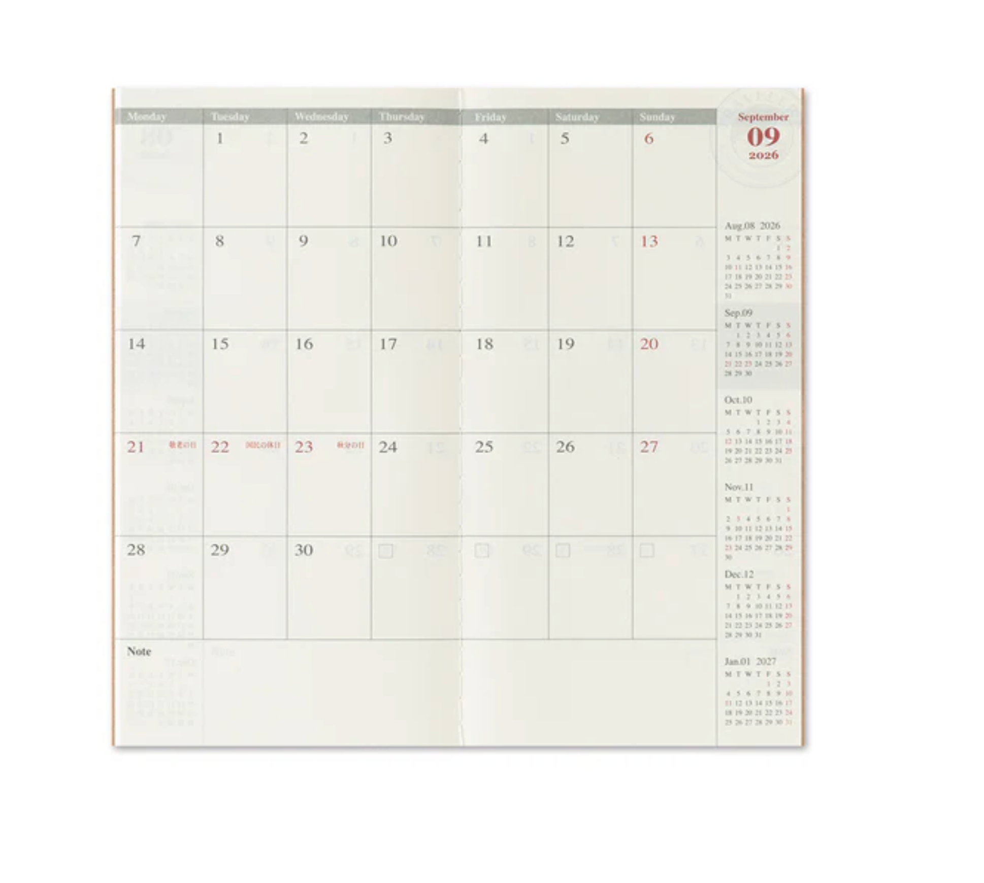 This monthly diary makes it perfect for recording anniversaries, birthdays, and important dates. It has a monthly 2026 schedule spanning December 2025 - January 2027. This refill has monthly calendars, a yearly schedule, a travel guide, blank pages, and a bonus of a sticker diary guide! Japanese MD Paper is used in these refills which means the paper is fountain pen friendly and bleed resistant.